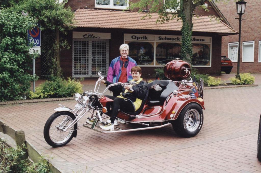 MühlentourEmden - EmdenTag 2: Greetsiel - Norden NorddeichFahrrad gegen Trike... Nach einem leckeren und unterhaltsamen Frühstück, mit zwei fitten Fünfzigerinnen, die radfahrmäßig ähnlich gelagert waren wie wir, machten wir zunächst einen Bummel durch den Ort. Um ca. 11 Uhr starteten wir mit den Rädern. Da der Ort überschaubar war, fanden wir auf Anhieb das Schild "Mühlentour". Später jedoch fuhren wir kilometerweit auf der "Rad und Padtour". Es beunruhigte uns nicht weiter, da die grobe Richtung stimmte. Irgendwann waren wir auch wieder auf der Mühlentour. Unterwegs sahen wir viele schöne Windmühlen und fotografierten sie auch eifrig. In Marienhafe fotografierten wir das Störtebeckerdenkmal. Dabei wurden wir von einem netten Trikefahrer angesprochen. Nach dem obligatorischen "wo kommt ihr her und wo wollt ihr hin" fragte er, ob er uns fotografieren solle . Ich sagte: "wenn, dann nur auf dem Trike." Gesagt, getan. Im Gegenzug habe ich ihn mit meinem Fahrrad abgelichtet. Solche Dinge erlebt man nur auf einer Radtour. Nach diesem kleinen Zwischenstopp ging es weiter nach Norden. Dort angekommen erkundigten wir uns wo unser Hotel sei, dass wir schon von zu Hause aus gebucht hatten. Wir waren etwas verwirrt, als sich herausstellte, dass es sich in Norden -Norddeich befand. Bei unserer Vorplanung sah es auf der Karte so aus, als ob der Weg weit von unserer eigentlichen Route entfernt sei. Deshalb hatten wir auch entschieden, ein Hotelzimmer in Norden zu buchen und nicht die Jugendherberge in Norddeich zu nehmen. Wir wollten zwar auch nach Norddeich, aber ohne Gepäck. Nun blieb uns nichts anderes übrig, als mit Gepäck nach Norden-Norddeich zu fahren. Wider Erwarten waren es jedoch nur fünf Kilometer. Wir waren angenehm überrascht. Das Hotel lag nur ca. 100 Meter vom Meer entfernt und fast unmittelbar neben der Jugendherberge (dafür hatten wir aber auch eine eigene Dusche) Nachdem wir uns frisch gemacht und mit Erdbeerkuchen gestärkt hatten, machten wir einen langen Spaziergang am Meer entlang. Am Morgen war es bewölkt und zwischendurch hatte es auch mal genieselt, in Norddeich war das Wetter jedoch wie gemalt. Es war ein rundum schöner Urlaubstag und gleichzeitig auch Muttertag.