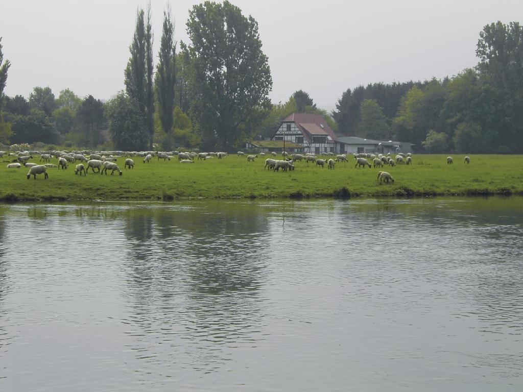 RuhrradwegWinterberg - KevelaerTag 3: Arnsberg - Schwerte / Wandhofen - 10.05.2004Plötzlich flußaufwärts... Als wir am Morgen aus dem Fenster blickten, war der Himmel grau verhangen. Die Straßen und Dächer waren naß, es hatte in der Nacht geregnet. Nach dem Frühstück bestiegen wir gegen 9 Uhr 45 unsere Räder. Da wir uns am Vorabend die Arnsberger Altstadt schon angesehen hatten und nicht sicher waren, ob es trocken bleiben würde, kürzten wir den Weg ab. Wir fuhren nicht die Ruhrschleife entlang, sondern steil den Berg hinunter und erreichten nach wenigen Kilometern den Radweg. Diesmal war die Strecke besser ausgeschildert und somit einfacher zu finden. Am Anfang führte sie meist unmittelbar am Ruhrufer entlang. über längere Zeit verlief parallel dazu die A46 auf der anderen Seite des Radweges. Wegen der Lärmschutzwände und Bepflanzung war sie nur durch die Motorengeräusche zu bemerken. Die Ruhr führte sehr viel Wasser und hatte eine starke Strömung. In Binnerfeld gab es dann plötzlich eine Überraschung, der Fluß strömte in die falsche Richtung. Nach intensivem Kartenstudium vermuteten wir, daß es sich um die Möhne handelte und wir am falschen Fluß entlang fuhren. In einem Fahrradgeschäft erkundigten wir uns nach dem richtigen Weg. Unsere Vermutung stimmte. Auf den wenigen Metern, die wir uns wegen einer Autobahnabfahrt, vom Ruhrufer entfernt hatten, hatte sich die Möhne dazwischen gemogelt. Wir fuhren ein kleines Stück zurück, über eine Holzbrücke auf die andere Flußseite und kamen dann zum Zusammenfluß von Ruhr und Möhne. Gewaltige Wassermassen flossen dort zusammen. An dieser Stelle war die Ruhr fast doppelt so breit wie einen Kilometer vorher. Im Laufe des Vormittags hatte sich das Wetter merklich gebessert. Der Himmel wurde klarer und die Temperaturen waren um einige Grade geklettert. Wir entledigten uns nach und nach einem Teil unserer Kleidung. In solchen Fällen ist es sehr bequem, wenn man seinen Kleiderschrank mitführt. Wenn man jedoch mal wieder eine Steigung schiebend bewältigen muß, denkt man anders. In Wickede besorgten wir uns leckere belegte Brötchen und einige Liter Apfelschorle. Kurze Zeit nachdem wir die Stadt verlassen hatten, fanden wir ein idyllisches Plätzchen für unser Picknick. Auf einer Wiese, auf der anderen Flußseite graste eine Herde Schafe. Sie schauten interessiert zu uns herüber. Einige versuchten auch ein Gespräch mit uns anzufangen. Leider haben wir die Sprache der Schafe nicht gelernt. Hinter Fröndenberg verließ der Weg die Flußnähe und wir merkten, daß wir die Berge noch nicht ganz hinter uns gelassen hatten. Die wunderschöne Gegend mit vielen leuchtend gelben Rapsfeldern, blühenden Obstbäumen und vielen schönen Gärten entschädigte uns für manches schwitzen und schieben. Es ist auch schade, das man den Duft, den man beim Radfahren wahrnimmt, nicht konservieren kann, so wie Fotos, die man später noch mal ansieht. Als wir den Bismarckturm erreicht hatten, entschieden wir uns weiter zu fahren. Am Morgen hatten wir uns eigentlich vorgenommen bis Unna zu fahren und dort zu übernachten. Es war noch früher Nachmittag und wir hatten noch Lust weiter zu fahren. In Schwerte sollte dann endgültig für heute Schluß sein. Kurz vor 16 Uhr erreichten wir die Stadt. Unser erster Weg führte zur Touristeninformation. Leider hatte die am Montag geschlossen. Etwas frustriert fuhren wir zum Bahnhof um uns anhand des Stadtplans orientieren zu können, wo die Unterkünfte aus dem Bikelineheft lagen. Wir telefonierten ein halbes Dutzend Nummern ab. Bei der einen lief ein Anrufbeantworter, die nächste war angeblich belegt und alle anderen hatten für unseren Geschmack unverschämte Preise. Wir hatten schon extra die Häuser aus der unteren Kategorie ausgewählt, aber wenn man überlegt, wie lange man für das Geld arbeiten muß, das man in einer Nacht verschläft, kommen einem die Tränen. Wir waren ziemlich frustriert. Uns blieb also letztendlich nichts anderes übrig als uns ein halbes Hotel zu kaufen. Bevor wir uns ziemlich gefrustet auf den Weg zu unserer überteuerten Unterkunft machten, aßen wir noch ein Teilchen. Der freundlichen Bedienung klagten wir unser Leid. Sie konnte uns aber leider auch nicht weiter helfen. Doch dann kam ein netter Kunde an unseren Tisch und meinte, er wüßte evtl. eine gute und günstige Übernachtungsmöglichkeit. In Wandhofen, einem Ortsteil von Schwerte, das auf unserem weiteren Weg lag, wäre ein ordentlicher Gasthof mit Fremdenzimmer. Wir hatten Glück. Zu vernünftigen Preisen bekamen wir ein ordentliches Zimmer mit Bad. Außerdem gab es zu moderaten Preisen ein leckeres Abendessen. Wir verfuttern doch lieber unser Geld, als daß wir es verschlafen. Nach dem Essen machten wir noch einen gemütlichen Verdauungsspaziergang durch den Ort und die Welt war wieder in Ordnung.