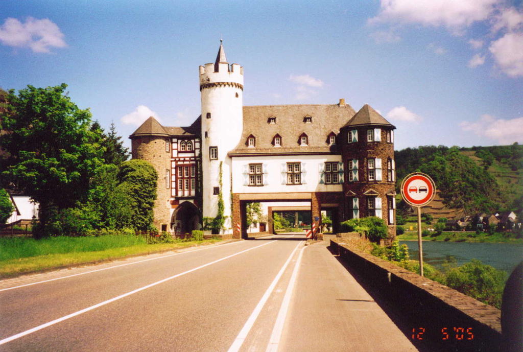 MoselradwegPerl - Koblenz - KrippTag 6: Pommern - Koblenz - 12.05.2005Am Deutschen Eck... Das Frühstück nahmen wir heute mit Blick auf die Mosel ein. Wir durften uns auch wieder ein Brötchen für unterwegs mitnehmen. Nach den obligatorischen Fotos vom Haus ging es um 10 Uhr los. Der Himmel war blau. Nur ein paar Schönwetterwolken waren zu sehen. Es war auch wärmer als an den Vortagen. Der Weg verlief ein langes Stück auf dem Randstreifen, direkt neben der Straße. Dieses Teilstück wird oft angegeben, wenn jemandem der Moselradweg nicht gefallen hat. Es hört sich dann immer so an, als ob der gesamte Moselradweg direkt neben der Straße verliefe. Rechts und links des Flusses sah man immer wieder Burgen oder Ruinen. Die Burgherren haben sich immer die besten Plätze ausgesucht. Wir hätten gerne die Burg Eltz gesehen, aber die lag versteckt hinter einem Berg und der Anstieg wäre mit unseren Fahrrädern sicher auch sehr mühsam gewesen. Man kann ja noch mal wiederkommen. In Löf machten wir unsere Einkäufe für den Tag, wovon ein großer Teil direkt verzehrt wurde. Ab Lehmen begann wieder ein separater Radweg. Im alten, malerischen Ortskern von Gondorf machten wir eine Kakao- bzw. Eispause. Es war mal wieder ein besonders schönes Fleckchen Erde. Danach ging es zügig weiter. Die Landschaft hatte sich auf der langen Tour verändert. Am Beginn der Reise, bestanden die Hänge fast nur aus Weinreben, mittlerweile gab es neben Weinreben oft felsige Abschnitte mit Sträuchern, niedrigen Bäumen und gelegentlichen Grasflächen. Wir fuhren heute die gesamte Strecke am linken Moselufer entlang, meist unmittelbar neben einer Bahnlinie. In Güls überquerten wir die Mosel und gelangten nach Koblenz. Am deutschen Eck, am Zusammenfluß von Mosel und Rhein, war dann das Ende unserer Moseltour erreicht. Irgendwie ist das für mich immer so etwas wie ein historischer Moment. Wir machten einige Erinnerungsfotos, wobei auch die Festung Ehrenbreitstein ein willkommenes Motiv war. Wir haben sie aber nur von unten abgelichtet. Der Weg hinauf war uns zu mühsam. Danach gingen wir in die Altstadt zur Touristeninformation und orderten ein Zimmer für die Nacht. Diesmal ohne Dusche, doch dafür bezahlbar und zentral gelegen. Nachdem wir uns frisch gemacht hatten, gingen wir zu Fuß zurück in die Innenstadt. Wir bummelten durch eine Buchhandlung und machten uns schon mal Gedanken über unsere Tour im nächsten Jahr. Wir haben auch schon was ins Auge gefaßt. Das Wetter war so angenehm, daß wir unser Abendessen, eine Pizza, draußen einnehmen konnten. Um 20 Uhr trafen wir uns dann mit Mecki, einem alten Freund von Klaus und erzählten von unserer Radtour. Die Moseltour war sehr schön und vor allen Dingen leicht zu fahren. Wir hatten auch im Gegensatz zu manch anderer Tour, nie Schwierigkeiten bei der Herbergssuche. In der Zeit der Weinfeste sieht es sicherlich damit anders aus. Etwas Gutes hat die Tour noch: die Woche ist noch nicht zu Ende und morgen dürfen wir noch ein Stück weiter fahren. Als wir im Bett lagen, erreichte uns noch ein Hilferuf von nebenan. Eine junge Frau saß auf der Toilette und hatte sich eingeschlossen Voller Panik hämmerte sie gegen die Türe. Letztendlich schaffte sie es dann doch noch sie aufzuschließen.