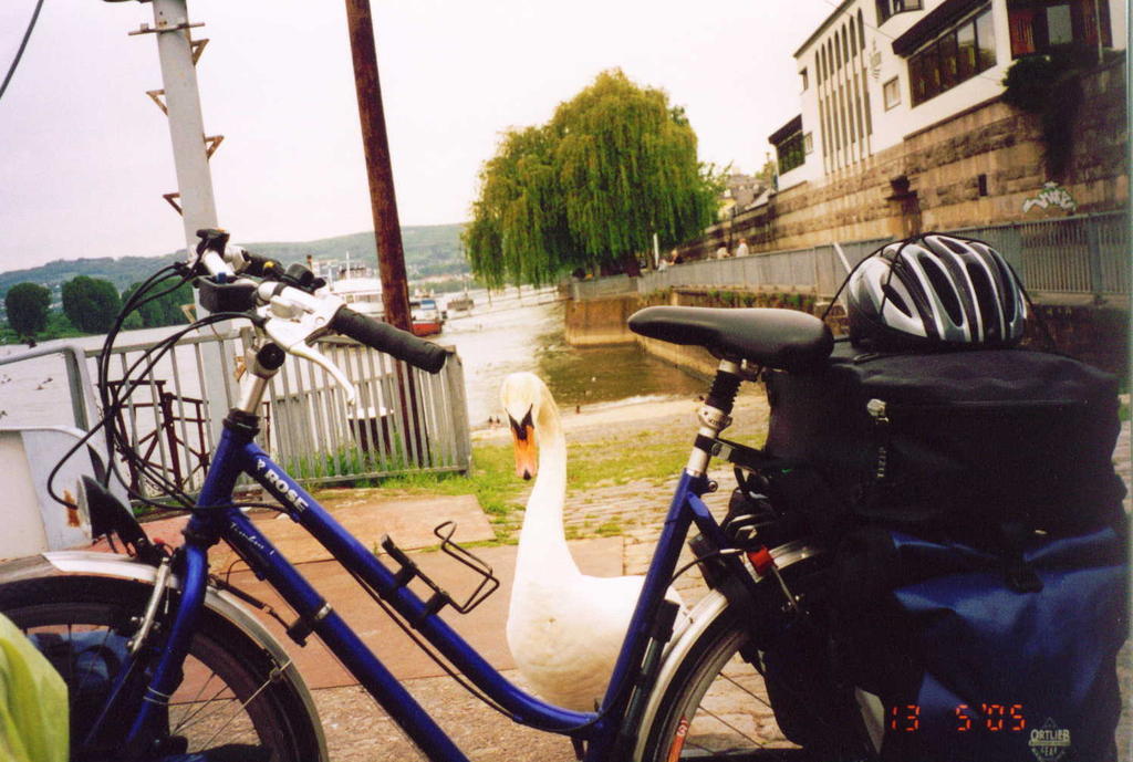 MoselradwegPerl - Koblenz - KrippTag 7: Koblenz - Kripp - 13.05.2005Rheinreise... Unser Wecker schellte heute eine Stunde früher, da die Frühstückszeit bis 9 Uhr begrenzt war. Das Frühstücksbuffet war gut und sehr umfangreich. Die Hotelchefin war sehr freundlich und kümmerte sich nett um ihre Gäste. Wir hatten sie am Vorabend nur kurz gesehen. Ihr Ehemann war uns am Abend schon positiv aufgefallen. Er hatte einen großen Teil unseres Gepäcks nach oben geschleppt. Kurz nach 9 Uhr starteten wir dann zu unserer Rheintour. Wir fanden schnell den richtigen „Ausgang“ aus Koblenz. Wir fuhren über die Pfaffendorfer Brücke auf die rechte Rheinseite. Nach den letzten Fotos von unserm alten Kaiser gelangten wir zügig bis zur A 48 Bensdorf - Neuwied. Hier waren die Radwegschilder plötzlich verschwunden und wir hatten das dumme Gefühl gleich auf der Autobahn zu landen. Da wir aber nicht im Radio erscheinen wollten, machten wir kehrt und suchten unser Glück in der Innenstadt. Als wir das Schild Rheinstraße sahen, gab es für uns kein Halten mehr. Der Weg endete nach einer flotten Abfahrt jedoch in einem Industrie und Bahngelände. Irgendwann gelangten wir dann doch noch auf den rechten Weg. Er führte meist in Sichtweite am Rhein entlang. Landschaftlich war es hier aber nicht so idyllisch wie an der Mosel. Auf dem Wasser herrschte reger Schiffsverkehr. Schon viele km im Voraus sahen wir das AKW Mülheim-Kärlich. In Neuwied machten wir direkt am Rhein unsere Mittagspause mit Brötchen und Joghurt. Ein Schwan leistete uns dabei Gesellschaft. Er war so zahm, daß er fast aufs Fahrrad stieg. Wir fuhren dann weiter bis Leutersdorf. Dort machten wir eine Kaffee- und Pippipause. Danach schafften wir dann auch den Anstieg vor Hammerstein. Wegen der überladenen Fahrräder natürlich schiebend. Weiter ging es dann, ohne anzuhalten, durch den ziemlich verrufenen Ort Bad Hönningen. Laut Hildegards Aussage kleben hier die Parkbänke ( hat sie aber auch nur vom Hörensagen ). Unbehelligt erreichten wir gegen 14.30 Uhr Linz. Zunächst stärkten wir uns mit einem dicken Eis. Dann versuchten wir ein erschwingliches Zimmer zu bekommen. Privatpensionen gab es nur ab 200 Höhenmetern und Hotels waren entweder besetzt oder für unseren kleinen Geldbeutel zu teuer. Also setzten wir mit der Fähre auf die andere Rheinseite über und versuchten unser Glück in Kripp. Wir fanden auch etwas; nicht gut, aber dafür trotzdem teuer. Diesmal aber wieder mit Dusche und WC. Nachdem wir diese benutzt hatten, fuhren wir nochmals mit der Fähre nach Linz. Gemütlich schlenderten wir durch den schönen Ort und ließen den Abend mit Pizza und Lasagne ausklingen. Wir hofften nur, es klappt mit dem Schlafen. In Kripp war Kirmes und das Festzelt stand dummerweise nur 50 Meter Luftlinie von unserem Hotel entfernt. Wie man`s macht, macht man’s falsch.