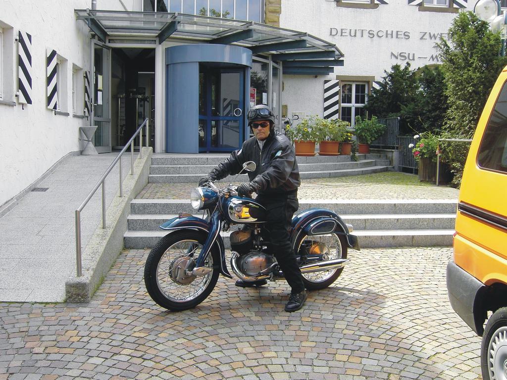 NeckarradwegVillingen-Schwenningen - MannheimTag 6: Lauffen - Eberbach - 01.09.2005Velos mit und ohne Motor... Gegen 9.30 Uhr fuhren wir in Lauffen los. Ausnahmsweise brauchten wir den Radweg nicht zu suchen; nach etwa einem Kilometer waren wir wieder in der Spur. Wir fuhren über die Brücke auf die rechte Neckarseite. Der Weg verlief über das Werksgelände eines Zementwerks und dann direkt am Fluß entlang. Wir entschieden uns für diese Flußseite, weil wir nicht durch die Weinberge berauf und bergab fahren wollten. Nach ca. 20 km und recht kurzer Fahrzeit erreichten wir Neckarsulm. Dort besuchten wir das Deutsche Zweiradmuseum. Es beherbergte eine riesige Fahrrad -und Motorradsammlung und einige NSU-Autos wie z.B. den Prinz. Über vier Etagen sah man alles, was das Herz eines Zweiradfahrers und Oldtimerfans höher schlagen läßt. Als Sonderausstellung waren Mopeds der Marke Kreidler ausgestellt. Da kam so manche Erinnerung an die 70er Jahre hoch. Manches wurde durch kurze Filme zusätzlich verdeutlicht. Es war eine tolle Ausstellung! Drei Stunden brauchten wir, um durch die Ausstellung zu kommen, es wurde uns dabei nicht langweilig. Dieser Abstecher hat sich gelohnt. Nach einem kleinen Imbiß ging es dann weiter. Nach dem Abschnitt durch das Weinbaugebiet am Neckar folgte nun eine Strecke an Burgen und Schlössern vorbei. Sie lagen in der Regel an exponierter Stelle hoch oben am Berg. Einige dieser Herrensitze wären es sicher wert gewesen, sie näher anzuschauen, aber dafür die Räder den Berg hochzuschieben, hielt uns davon ab. Um alles wirklich in Ruhe anzusehen und auch die vielen schönen Orte zu durchfahren, müßte man doppelt so viel Zeit haben. Es war heute sehr heiß und der Schweiß lief in Strömen. Ich hatte seit einigen Tagen eine kurze Radlerhose an und mir trotz Sonnencreme einen kräftigen Sonnenbrand zugezogen. Besonders die Stellen oberhalb der Knöchel waren stark verbrannt, so daß ich mir unterwegs wieder eine lange Hose anziehen mußte. In Obrigheim war der letzte Tropfen Flüssigkeit aufgebraucht und wir mußten dringend „tanken“. Nach zwei großen Gläsern Wasser bzw. Radler ging es uns wieder besser. Wir besorgten uns dann noch zusätzlich Saft und Obst für unterwegs. Mit vollen Akkus ging es dann weiter. In Zwingenberg setzten wir mit der Fähre über, um uns einen Anstieg zu ersparen. Der Weg durch den Wald war etwas holprig. Man hatte von der linken Neckarseite aber einen schönen Blick auf die Burg Zwingenberg. Gegen 19 Uhr waren wir dann in Eberbach, dem Ziel des heutigen Tages. Nachdem wir in der Stadt gegessen hatten, saßen wir noch lange bei einem Glas Wein, gemeinsam mit unseren Vermietern, im Garten. Bei einer netten Unterhaltung genossen wir den warmen Sommerabend.
