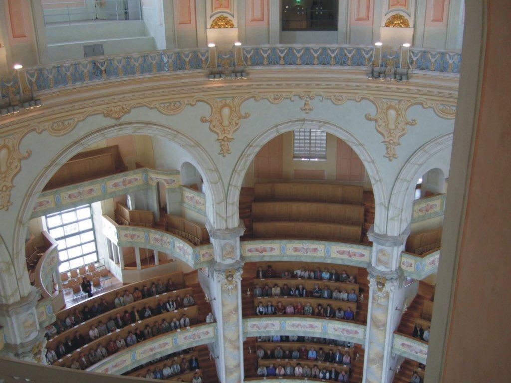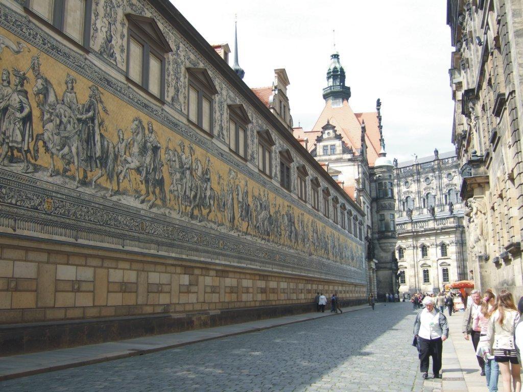 Elberadweg, Teil 1Bad Schandau - MagdeburgTag 4: Dresden - 28.04.2008Soweit die Füße tragen... Zur üblichen Zeit, um 8.30 Uhr saßen wir am Frühstückstisch. Heute hatten wir keine Eile. Gegen 10.30 Uhr fuhren wir mit der Straßenbahn in die Innenstadt. Bei Sonnenlicht fanden wir die Haltestelle in wenigen Minuten. Kurze Zeit später waren wir auch schon in der Stadt. Natürlich ging unser erster Weg wieder zur Frauenkirche. Wieder Erwarten brauchten wir nicht anzustehen oder Eintritt zu bezahlen. Es waren viele Besucher in der Kirche, sie war aber nicht überfüllt. Sie war wirklich sehr sehr schön. Helle Pastellfarben und ein prunkvoller Altarraum mit vielen Goldverzierungen und großen darüberstehenden Orgelpfeifen ließen den Raum freundlich und hell erstrahlen. Die Kirche ist ein Rundbau und, obwohl sie Platz für 1800 Menschen bietet, wirkt sie nicht übermäßig groß. Es gibt insgesamt fünf Emporen. Von dort ist der Blick sicherlich besonders schön. Dorthin gelangt man nur nach vorheriger Anmeldung und mit einem Führer. Es ist schon etwas ganz Besonderes, diese Kirche, die in den letzten Kriegsjahren völlig zerstört wurde, in dieser Pracht zu sehen. Vor ca. 8 Jahren habe ich sie von außen beim Wiederaufbau zum ersten mal gesehen. Sie ist ein wunderschönes Gotteshaus und für viele Menschen, nicht nur in Dresden, ein Sinnbild für Neuanfang. Nachdem wir uns die Kirche von innen angesehen hatten, wollten wir in jedem Fall noch die Aussichtsplattform über der Kuppel besteigen. 8€ Eintritt sind nicht preiswert, aber sie haben sich gelohnt. Zuerst fuhren wir einige Stockwerke mit einem Aufzug hinauf. Dann ging es über einen ansteigenden Gang immer höher hinauf. Dabei konnte man durch innen gelegene Fenster ins Innere der Frauenkirche sehen. Die letzten Meter führten über eine Eisentreppe nach draußen zur Kuppelspitze. Von hier hatten wir einen phantastischen Ausblick über Dresden, die Elbe und die Umgebung. Das Wetter war sonnig und klar und wir genossen das Stadtpanorama. Man hätte vielleicht auch von einem anderen Turm der Stadt eine ähnliche Aussicht gehabt, aber den Blick ins Kircheninnere beim Auf- und Abstieg hätten wir verpaßt. Nachdem wir die Frauenkirche verlassen hatten, gingen wir durch die Augustusstraße an der Ahnengalerie, dem sogenannten Fürstenzug vorbei. Es ist ein Wandfries auf dem 35 Herrscher zu Pferde aus dem Hause Wettin von 1127-1904 dargestellt sind; außerdem noch Adlige, Militärs, Künstler, Gelehrte und der Schöpfer und seine Gehilfen. Es besteht aus Meissner Kacheln und ist das größte Porzellanbild der Welt. Danach gingen wir weiter zum Schloßplatz und kamen an der Kath. Hofkirche und am Ständehaus vorbei. Wir gelangten dann zum Theaterplatz. Dort befindet sich auf der rechten Seite die berühmte Semperoper und geradeaus der Zwinger. So viele berühmte Gebäude so nah beieinander sind schon beeindruckend. Für den Zwinger nahmen wir uns sehr viel Zeit. Diese vielen Eindrücke kann man nicht wiedergeben. Alles, was wir sahen, war phantastisch. Heute besichtigten wir nur die Außenanlagen. Für morgen haben wir uns einige Museumsbesuche vorgenommen. Unsere Fotoapparate mußten wieder mal alles geben. Hildegard mußte an ihrer Kamera schon nach drei Tagen die Batterien austauschen. Die Zeit verging wie im Fluge und um 13.30 Uhr machten wir langsam schlapp. In einer Pizzeria füllten wir unsere eigenen Batterien wieder auf und gönnten unseren Füßen eine Verschnaufpause. Anschließend versuchten wir in die Semperoper zu gelangen. Leider gab es am Nachmittag keine Besichtigungsmöglichkeit mehr und auch am Folgetag war wegen Probe geschlossen. Schade, aber es gab ja noch einiges Andere zu sehen. Wir gingen ein Stück auf die Augustusbrücke, um die Silhouette der Stadt zu bewundern. Danach gingen wir über die Brühlschen Terrassen bis zum Park vor der Hochschule der bildenden Künste. Wir hatten einen weiten Blick über die Elbe und auf Dresden Neustadt. Nun machten wir uns auf die Suche nach dem Pulverturmkeller .Alfred, Hildegards Mann, hatte dieses Restaurant vor einigen Jahren mit Kollegen besucht und es Hildegard wärmstens empfohlen. Wir fanden es in unmittelbarer Nähe der Frauenkirche. Der Name war leicht irreführend. Wir hielten Ausschau nach einem Turm. Den gab es schon lange nicht mehr, sondern nur die Reste eines alten Kellers von einem früheren Pulverturm. Es war ein sehr uriges Restaurant. Wir fühlten uns in einen Rittersaal oder in eine alte Schloßküche versetzt. Die Räume waren rustikal eingerichtet und mit Gegenständen aus dem Mittelalter dekoriert. Wir tranken nur einen Kaffee. Da am Nachmittag kaum Gäste anwesend waren, konnten wir uns alles in Ruhe ansehen Für den Abend reservierten wir uns einen Tisch. Nach dieser kleinen Pause fuhren wir mit der Straßenbahn über die Carolabrücke auf die andere Elbseite. Vom Albertsplatz gingen wir zur Pfundsmolkerei. Es ist der schönste Milchladen der Welt. Wände und Decken sind mit farbigen Majolikafliesen der Firma Villeroy und Boch geschmückt. Es gibt auch heute noch die verschiedenen Molkereiprodukte zu kaufen. Nebenan besuchten wir noch kurz einen Senfladen. Anschließend wollten wir uns noch die Neustadt weiter ansehen, aber die vielen Punks und das ungepflegte und heruntergekommene Stadtbild ließen uns unsere Pläne ändern. Wir fuhren mit der Straßenbahn zurück bis zum Bahnhof und liefen dann an der Shoppingmeile vorbei zurück bis zur Altstadt. Pünktlich um 20 Uhr erreichten wir wieder den Pulverturmkeller. Zum Glück hatten wir einen Tisch reserviert. Das Restaurant war bis auf den letzten Platz gefüllt. Passend zur Einrichtung war das Personal in mittelalterliche Gewänder gekleidet. Gaukler und Musikanten unterhielten die Gäste. Das Essen war wie erwartet hervorragend. Unsere Heimfahrt verlief im Gegensatz zum Vortag unspektakulär. Wir hatten uns den Weg gemerkt und erreichten kurz nach 22 Uhr unsere kleine Ferienwohnung.
