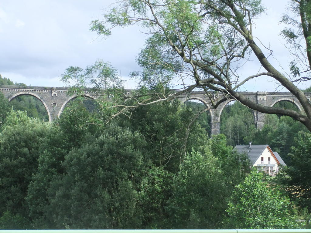 Deutschland Ost-WestZittau - AachenTag 4: Dresden - Chemnitz - 13.07.2012Berg und Talfahrt... Heute ist Freitag der 13. und einige schwarze Katzen sind auch von links nach rechts über die Straße gelaufen, trotzdem ist nichts passiert. Jetzt, beim Schreiben des Tagebuchs, muß ich aber zugeben, daß ich sehr erledigt bin. Es sind heute 95 km Berg- und Talfahrt geworden. Ich hatte mit 70-80 km gerechnet; natürlich auch mit Bergen. Die kürzeren Strecken von Dresden nach Chemnitz sind zum einen für Radfahrer verboten, oder lebensgefährlich, sie wären über die A4 oder die B 173 gegangen. Mein Weg war in jedem Fall schöner, führte aber im Zickzack von Dresden nach Chemnitz. In Dresden fand ich sofort an der ersten Kreuzung ein Schild mit der Aufschrift: Ost-West Route. Super! Diesem Schild mußte ich jetzt einfach nur noch nachfahren. Nach wenigen Kilometern gab es dieses Schild aber nicht mehr und ich hielt nach "normalen" Schildern Ausschau. Ich steckte dann in diversen Wohngebieten fest. Die Passanten, die ich nach dem Weg fragte, wollten mich immer auf die Bundesstraße schicken. Es gab hier vermutlich nur Autofahrer. In Pesterwitz wollte ich eigentlich nur ein paar Briefmarken kaufen, aber da kam mir der spontane Geistesblitz, ein paar Dinge nach Hause zu schicken. Ich hatte mal wieder zu viel mitgenommen. Abends fein ausgehen wollte ich eh nicht und jedes Gramm wiegt beim Rauffahren oder Schieben doppelt. Also ein Paket gepackt und weg damit. Nun ging es zunächst rasant den Berg runter. Ich fuhr über Freital nach Tharandt und wollte dann Richtung Naundorf. Auf der Karte war ein direkter Weg durch einen Wald eingezeichnet. Als ich aber den Abzweig erreichte und auf dem Schild sah, welche Steigung auf mich zukommen würde, beschloß ich, doch die längere Radroute um den Berg herum zu nehmen. Der Weg führte über kleine Straßen durch Spechtshausen und Pohrsdorf. Dann folgte eine lange Abfahrt durch den Wald auf einem unbefestigten Weg nach Grund. Ich mußte höllisch aufpassen, daß ich nicht rutschte. Der Weg war steil und vom Regen aufgeweicht. Trotzdem freute ich mich über jede Abfahrt. Besser einmal nicht kräftig in die Pedale treten oder laufen, dafür aber bremsen müssen. Nachdem der Weg um den Tharanterwald geschafft war, kam ich langsam in Richtung Freiberg. Eigentlich wollte ich hier eine Pause machen; zumal die Stadt sehr schön ist, aber die Uhr zeigte bereits halb drei und ich hatte noch einen weiten Weg vor mir. Ich habe zwischendurch reichlich Wasser getrunken, Bananen oder ein paar Nußplätzchen gegessen. Das war wie auftanken und es ging wieder eine Weile besser. Der Weg führte weiter über Frankenstein und Oederan. Dort kam ich an einem alten Eisenbahnviadukt vorbei. Danach folgte ein schöner Weg an der Plöha entlang. Ein freundlicher, fitter Rentner änderte extra seine Tour und fuhr auf dem Rad bis Niederwiesa vor mir her. Danach mußte er nach Hause, da seine Frau mit dem Abendessen wartete. Gegen 19.30 Uhr hatte ich mein Tagesziel, die neue DJH in Chemnitz erreicht. Das, was ich auf der Fahrt durch die Stadt gesehen hatte, gefiel mir nicht besonders; viele heruntergekommene, mit Graffiti verschmierte Plattenbauten. Im Zentrum gab es einige hochmoderne Gebäude, doch das Publikum, das sich auf den Plätzen davor aufhielt, sah nicht gerade vertrauenserweckend aus. U.a. Punks mit Hunden und andere herumlungernde Typen mit Bierdosen. Deshalb hatte ich keine Lust mehr zum Essen in die Stadt zu gehen, sondern begnügte mich mit einem kalten Abendbrot in der JH. Zu meiner Beruhigung erfuhr ich, daß ein anderer Radfahrer, der ebenfalls aus Dresden gekommen war, auch 92 km gefahren ist. Ich war also gar nicht so schlecht.