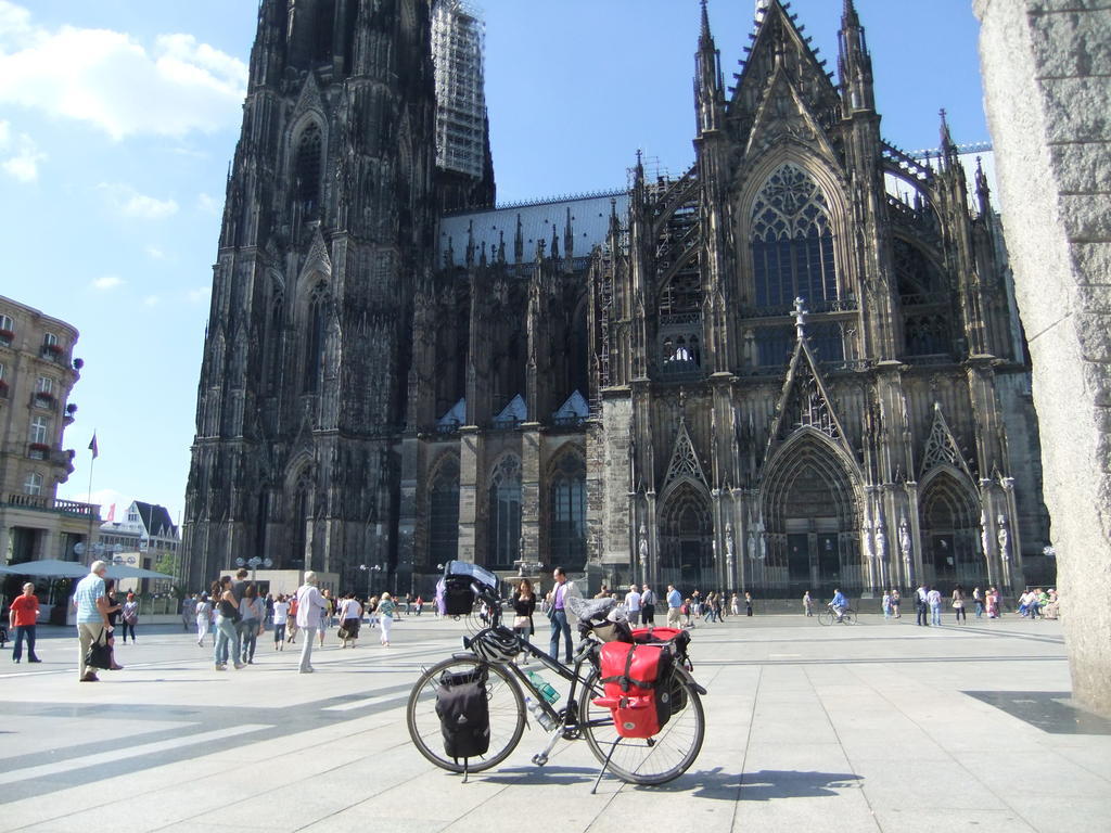 Deutschland Ost-WestZittau - AachenTag 13: Rosbach - Neubottenbroich - 22.07.2012Warum ist es am Rhein so schön... Es ist schon ganz anders, wenn man bei Freunden übernachtet, als wenn man in einer Pension ist, besonders, wenn man alleine unterwegs ist. Mit vielen guten Wünschen und dem Versprechen, sich bald wiederzusehen, ging es um 10.15 Uhr wieder los. Heute war das ideale Radelwetter: blauer Himmel, Sonnenschein und Windstille. Der Weg war ebenfalls sehr schön und nicht zu vergleichen mit dem Abschnitt, den ich gestern an der Sieg entlang gefahren bin. Er verlief meist auf einem separaten Weg direkt am Ufer der Sieg. Es waren nur wenige Steigungen zu bewältigen. Bei diesem schönen Sonntagswetter waren viele Radfahrer und Spaziergänger unterwegs. Ich gelangte problemlos nach Siegburg und machte dort eine ausgiebige Picknickpause. Danach ging es weiter in Richtung Troisdorf und von dort durch die Felder in Richtung Porz. Es ging weiter flott voran. Es war ein ganz anderes Bild, als an den anderen Tagen meiner Tour. Ich konnte weit in die Ferne schauen und mußte keine Berge umfahren oder erklimmen und konnte mich wieder auf meinen Orientierungssinn verlassen. Wenn man am Niederrhein zu Hause ist, gefallen einem zwar die Berge und man fährt gerne dorthin in Urlaub, aber wohler fühlt man sich im Flachland. Der Weg führte an einem großen Golfplatz vorbei. Auch dort herrschte reger Betrieb. In Zündorf setzte ich mit einer kleinen Personenfähre, dem Krokodil über den Rhein, nach Weiss über. Am Rhein war heute Hochbetrieb. Viele Ausflügler genossen den tollen Sommertag. Die Leute sonnten sich am Wasser, radelten, joggten oder spazierten am Rheinufer entlang. Ich mußte konzentriert fahren, um mit niemanden zusammen zu stoßen. Wenn ich gewollt hätte, wäre ich am frühen Nachmittag in Horrem bei meiner nächsten Anlaufstelle gewesen, aber ich wollte noch zum Dom. So wurde die Strecke eben etwas länger. Am ganzen Rheinufer war so etwas wie Volksfeststimmung. Ich bin selten in Köln, aber ich hatte das Gefühl, die Stadt platzt aus allen Nähten. Musik und Lebensfreude war zu hören und zu sehen. Es war ein schönes Gefühl, mit dem Rad vor dem Kölner Dom zu stehen. Da kam ein Gefühl von Dankbarkeit auf, daß ich die Reise bisher unbeschadet geschafft hatte. Anschließend fuhr ich auf direktem Weg zu unseren Freunden nach Horrem. Hier wurde ich auch wieder sehr herzlich empfangen. Nach der Begrüßung ging es erst mal unter die Dusche und dann fing der gemütliche Teil des Abends an.
