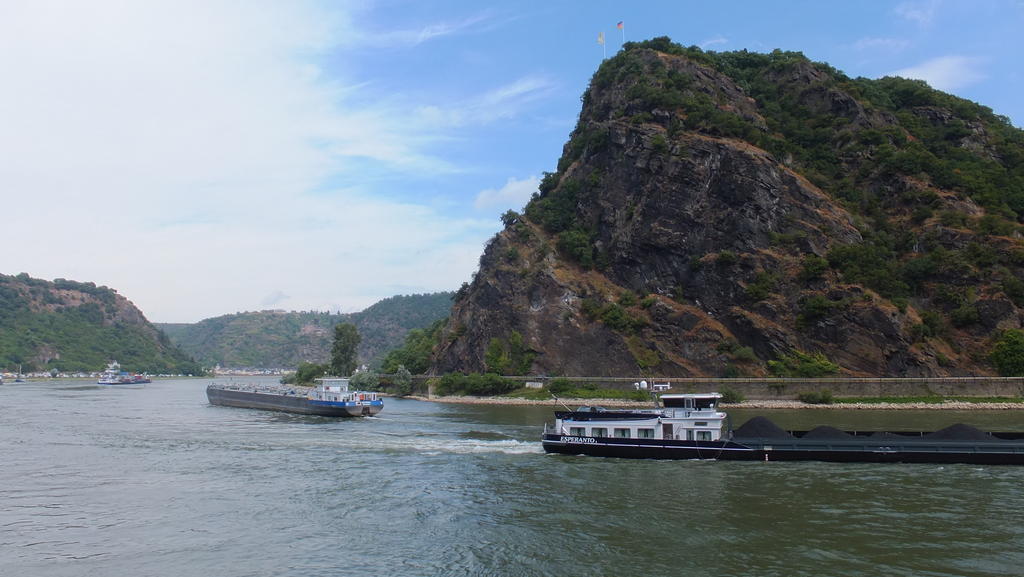 MittelrheinradwegMainz - DüsseldorfTag 2: Geisenheim - Spay - 07.08.2013Darum ist es am Rhein so schön... n der Nacht hatte es kräftig geregnet. Es war, wie es sich später herausstellte, schon der gesamte für den Tag gemeldete Regen. So herum war es uns natürlich am liebsten. Gegen 9.50 Uhr ging es los. Wir hatten beide recht gut geschlafen, gut gefrühstückt und fühlten uns dementsprechend fit. Einmal durch den Ort und schon waren wir wieder auf dem Rheinradweg. Es war etwas trüb, aber warm genug für kurze Hosen. Kurze Zeit später erreichten wir Rüdesheim. Hier herrschte schon am Morgen reichlich Rummel. Die berühmte Drosselgasse und das Niederwalddenkmal ziehen schon seit Jahrzehnten Busladungen voller Touristen an. Nun setzten wir mit der Fähre auf die andere Rheinseite nach Bingen über. Wie empfohlen fuhren wir nun linksrheinisch weiter. Der Radweg war gut gekennzeichnet und gut ausgebaut. Überwiegend war er asphaltiert und verlief in Sichtweite des Rheins. Unzählige Burgruinen entlang des Flusses boten reichlich Fotomotive. Die früheren Burgherren hatten sich herausragende Stellen ausgesucht. Wir fuhren an bekannten Orten wie Bacharach und Oberwesel vorbei und machten in Sichtweite der Loreley eine gemütliche Mittagspause. Der Rheinradweg ist beliebt; viele Radler tummelten sich in beiden Richtungen auf dem Weg. Wir hatten heute Glück mit dem Wind, er schob uns, Berge waren auch nicht zu erklimmen und so kamen wir gut voran. Es ging weiter über St. Goar, Bad Salzig bis Boppard. Nun versuchten wir telefonisch für die Nacht ein Zimmer zu ordern, leider erfolglos. In Boppard selbst war uns der Touristenrummel zu groß und die Preise zu hoch. In der Touristeninformation konnte man uns nicht weiterhelfen, da wir nicht im Ort bleiben wollten, sondern noch etwas weiter rheinabwärts fahren wollten. So weit ging aber das Einzugsgebiet der Touristeninformation nicht. Im nächsten Ort wurden wir fündig. In einem Gasthof bekamen wir ein schönes Zimmer mit Rheinblick. Unser Abendessen nahmen wir auf der Terrasse ein. Wir saßen lange draußen und beobachteten die Schiffe und auf dem gegenüberliegenden Ufer die vorbeifahrenden Züge. Wir genossen den schönen Abend und ließen den Tag revue passieren.