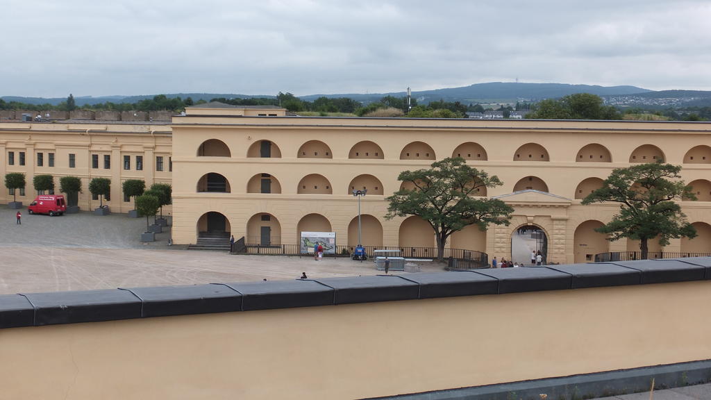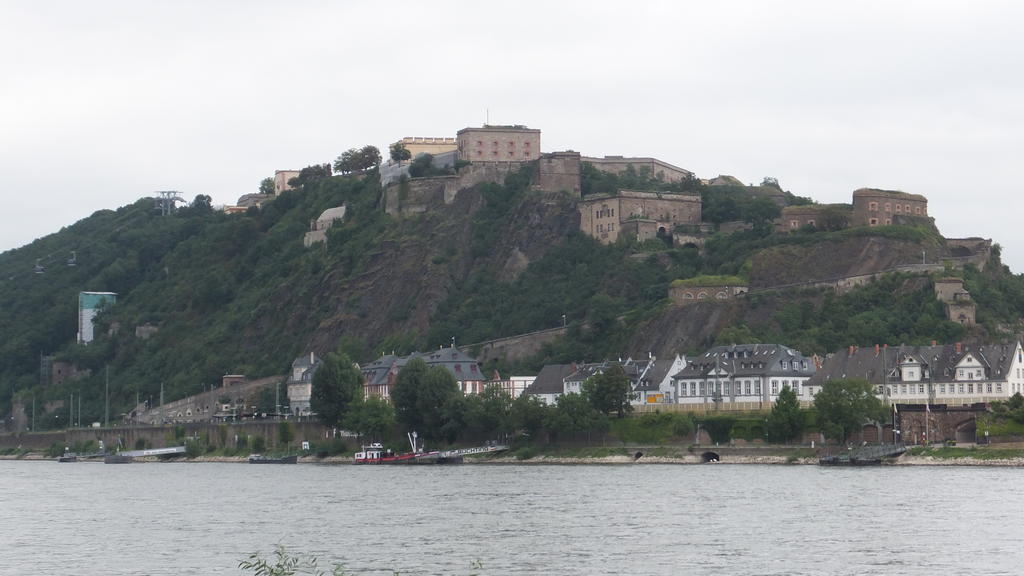 MittelrheinradwegMainz - DüsseldorfTag 3: Spay - Koblenz - 08.08.2013Auf der Festung... Kurz vor 10 Uhr ging es nach einem reichhaltigen Frühstück los. Der Himmel war weniger bewölkt als am gestrigen Tag, doch die Sonne wollte sich nicht so recht blicken lassen. Zum Radfahren war die Temperatur aber durchaus gut. Heute hatten wir leichten Gegenwind und eine Holperstrecke auf altem Kopfsteinpflaster bremste unseren Vorwärtsdrang. Wir machten eine kurze Pause, als wir das gegenüberliegende Ufer von Lahnstein erreichten. Nun stand ich an der Stelle, die ich vor kurzem von der anderen Rheinseite her gesehen hatte, als ich mit Hildegard die Lahnmündung erreicht hatte. Wenig später waren wir in Koblenz. Wir fuhren durch eine Allee am Rheinufer entlang, an der schöne alten Villen standen. Die Gegend um das Deutsche Eck war vor zwei Jahren, anlässlich der Bundesgartenschau neu hergerichtet worden. An der Seilbahnstation wollten wir unsere Räder abstellen und das Gepäck im Schließfach einschließen. Leider bestand keine Möglichkeit das Gepäck unterzustellen. Das ist verwunderlich, zumal viele Leute mit dem Rad unterwegs sind. Bei der Bundesgartenschau soll es hier Gepäckfächer gegeben haben. Wir wurden an die Bahnhofsschließfächer verwiesen. Leicht verärgert machten wir uns auf den Weg zum Hauptbahnhof. Nach einigen hundert Metern hielten wir an einer Straßenkreuzung um uns zu orientieren Dort wurden wir von einem Mann angesprochen. Als er hörte, weshalb wir zum Bahnhof wollten, bot er spontan an, die Räder mit Gepäck bei ihm unterzustellen. Das war riesig nett und wir nahmen sein Angebot an. Er war selber Radfahrer und kannte die Problematik. Auch er verstand nicht weshalb die Gepäckaufbewahrung an der Seilbahnstation nicht mehr existierte. Nun konnten wir beruhigt mit der Seilbahn zur Festung Ehrenbreitstein hinauffahren. Sie thront 118 Meter über dem Rhein. Von dort hat man einen tollen Blick auf das Deutsche Eck, den Zusammenfluß von Rhein und Mosel. Auch die Fahrt hinauf über den Rhein war wieder ein Erlebnis. Leider war oben auf dem Berg nur noch wenig von der Blumenpracht der Bundesgartenschau übrig geblieben. Wir wollten aber in erster Linie die Festung erkunden. Das ist aber an einem halben Tag unmöglich. Die Anlage ist so weitläufig und verschachtelt, daß wir nur einen groben Überblick erhielten. Seit rund 5000 Jahren ist die Gebirgsnase besiedelt und wurde von den verschiedenen Bewohnern immer weiter ausgebaut und vergrößert. Verschiedene Ausstellungen und eine Multimedia-Inszenierung gaben uns einen Einblick in den Aufbau und die Geschichte der Anlage. Der Plan zur Erbauung als Festung stammt vom Preußenkönig Friedrich III Anfang des 1800 Jahrhunderts. 1500 Mann und 80 Geschütze betrug die volle Gefechtsstärke. Moderne Kriegsführung und Waffentechniken verdammten die Festung schon bald nach ihrer Fertigstellung zu strategischer Bedeutungslosigkeit. Die Anlage wurde zum Glück nie zerstört und ist heute ein Ort friedlicher Begegnung für Menschen aus aller Welt. Hier oben gibt es zudem auch eine Jugendherberge, die wir aber nicht in Anspruch nehmen wollten, da wir eine Einladung zum Übernachten hatten. Kurz nach 15 Uhr waren wir wieder an unseren Rädern. Dann fuhren wir ein kurzes Stück am Moselufer entlang zu Klaus’ Freund Mecki. Bei einem Stück Kuchen gab es Einiges zu erzählen. Gegen 18Uhr machten wir uns zu dritt auf in die Stadt. Bei einem Inder gab es was Gutes für das leibliche Wohl. Danach machten wir, angeführt von Mecki noch eine kleine Stadtrundfahrt mit unseren Rädern. Anschließend fuhren wir ein zweites Mal hinauf zur Festung Ehrenbreitstein. Regelmäßig finden dort kulturelle Veranstaltungen und Konzerte mit unterschiedlichen Interpreten statt, die Mecki auch nach Möglichkeit besucht. Heute gab es ein Konzert der Simon & Garfunkel Revival-Band. Menschenmassen strömten zusammen. Auf einem großen Innenhof vor der Bühne standen die Leute dicht an dicht. Es war kein durchkommen. Zudem war die Musik seltsamerweise so leise, daß man kaum etwas hören konnte; vom Sehen ganz zu schweigen. Wir versuchten einen besseren Standort zu ergattern, gaben es aber nach kurzer Zeit auf. Stattdessen gingen wir auf den großen Platz außerhalb des Konzertgeländes. Von dort hatten wir einen schönen Ausblick auf Koblenz. Auch hier mussten die Leute anstehen, hier allerdings um an Getränke zu kommen. Wir drei unterhielten uns angeregt und genossen die schöne Atmosphäre und den Ausblick. Der Sonnenuntergang und die Lichter der Stadt waren es wert hier hinauf gefahren zu sein. Erst sehr spät, nach einem Absacker legten wir uns auf Meckis Besuchercouch.