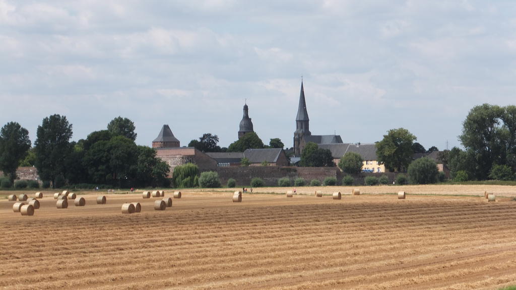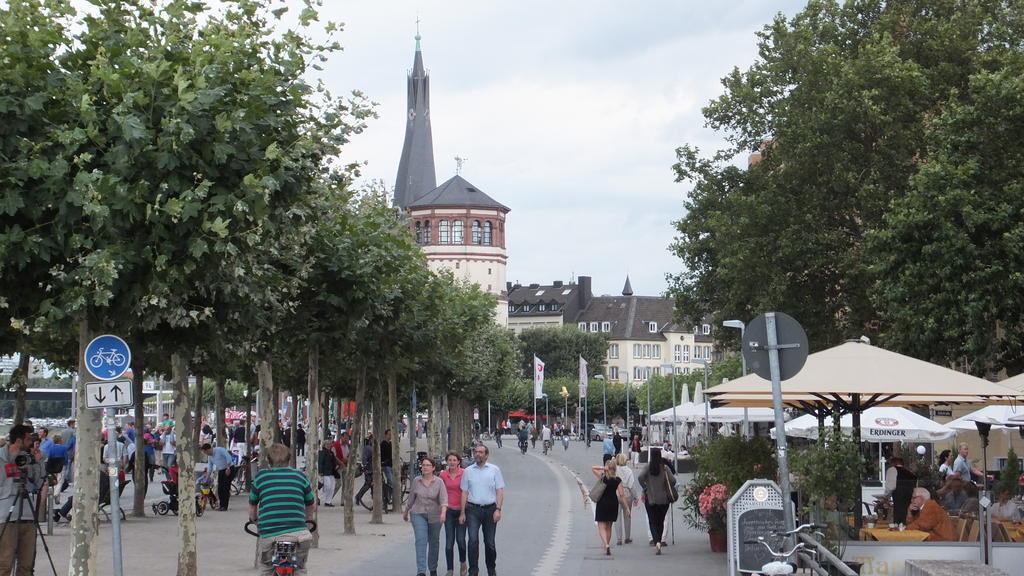 MittelrheinradwegMainz - DüsseldorfTag 6: Köln - Büderich - 11.08.2013Überraschende Begegnung... Nach dem Frühstück packten wir unsere Räder direkt im Frühstücksraum. Aufgestiegen sind wir aber erst vor der Haustüre. Es ging als erstes noch mal zum Dom. Heute war die Innenstadt bedeutend ruhiger. Die meisten Leute schliefen wohl noch, weil Sonntag war. Wir machten ein paar Erinnerungsfotos und schon ging es wieder auf den Rheinradweg. Zunächst fuhren wir auf dem Promenadeweg direkt am Rheinufer entlang. Mit dem Wetter hatten wir auch heute wieder Glück, es schien bereits am Morgen die Sonne. Der Weg verlief dann einige Kilometer über eine schattige Allee. Hier waren schon einige Jogger, Radfahrer, Hunde mit Herrchen und Familien unterwegs. Nach der Hafenausfahrt fuhren wir am riesigen Werksgelände der Fordwerke entlang. Danach wurde es etwas ländlicher. An der Fähre in Lange machten wir in einem neugebauten Ausflugslokal eine Kaffeepause. Hier herrschte reger Betrieb und auch die Fähre hatte genug zu tun. Nach der kleinen Pause führte der Weg über einen Deich. Durch den Gegenwind wurden wir etwas ausgebremst. Nebeneinander herfahren war auch kaum möglich. Viele Radler waren unterwegs, einige kamen uns entgegen, andere waren schneller als wir und überholten. Wir freuten uns schon auf Zons. Die alte Feste wollten wir auf jeden Fall wieder mal besuchen, andere wollten das aber auch. Hier knubbelten sich die Menschenmassen. Wir schoben die Räder durch die engen Gassen und hatten Mühe, einen Sitzplatz in einem Eiscafe zu ergattern. Als wir es endlich geschafft hatten und gemütlich bei einem Stück Pflaumenkuchen saßen und die Leute beobachteten, entdeckten wir plötzlich Irmgard und Uli, alte Freunde von uns, die in der Schlange vor dem Eisstand anstanden. Es war ein großes „Hallo“, als sie uns entdeckten. Die beiden waren auf dem Rückweg aus Bonn, wo sie das Wochenende verbracht hatten. Nun gab es Einiges zu erzählen. Nach der langen Pause setzten wir mit der Fähre auf die andere Rheinseite über. Wir besuchten Schloß Benrath. Der schöne Park und das Schloß boten eine Menge Fotomotive. Danach verließen wir den ausgeschilderten Radweg und fuhren auf direktem Weg zum Mannesmannufer. Hier herrschten wie immer Trubel und Geselligkeit. Die Rheinpromenade bietet reichlich Gelegenheit zum Essen und Trinken. Wir wollten aber wieder auf die linke Rheinseite und fuhren über die Oberkasseler Brücke nach Oberkassel. Es war bereits später Nachmittag und wir versuchten nun eine Übernachtungsmöglichkeit zu finden. Die vorhandenen Hotels waren uns aber zu teuer und deshalb fuhren wir weiter bis Büderich. Es wurde langsam eng und immer später. Außerdem setzte leichter Regen ein. Unser Bikelineheft konnte uns nicht weiterhelfen, da wir uns vom Rheinradweg entfernten. Wir fuhren weiter bis Büderich. Dort fragten wir einige Passanten nach einer Pension oder dergleichen. Leider hatte die einzige Pension im Ort geschlossen und so blieb uns nur die Möglichkeit im Hotel zu übernachten, was wir dann auch machten. Das Ambiente war natürlich besser, als die meisten Schlafplätze vorher, aber auch um einiges teurer. Zum Abendessen gingen wir in eine nahegelegene Pizzeria. Die Pizza war ausgezeichnet und versöhnte uns etwas mit der kostspieligen Übernachtung.