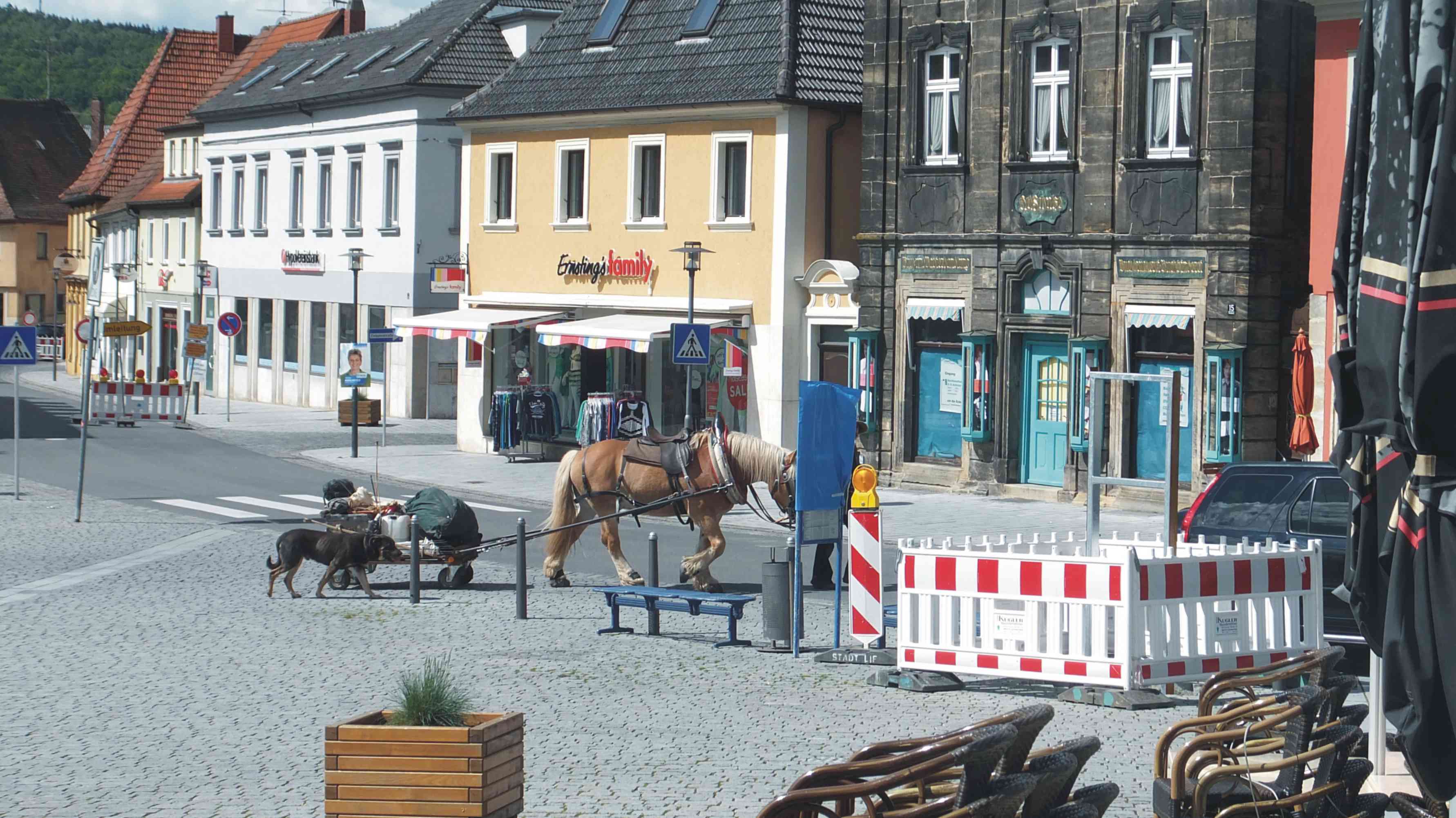 In Hochstadt trafen wir dann wieder auf die Hauptroute. Es ging weiter bis Lichtenfels. Dort gönnten wir uns auf dem schönen Marktplatz einen leckeren Eisbecher und beobachteten die Leute. Besonders aufgefallen ist uns ein Trio bestehend aus einem Mann, seinem Pferd und seinem Hund. Das Pferd war gesattelt und zog einen selbstgebauten, mit allerlei Gepäck beladenen, merkwürdigen Wagen hinter sich her. Im Mittelalter hätte man den Mann für einen Pilger halten können. Wer weiß, vielleicht war er auch einer?