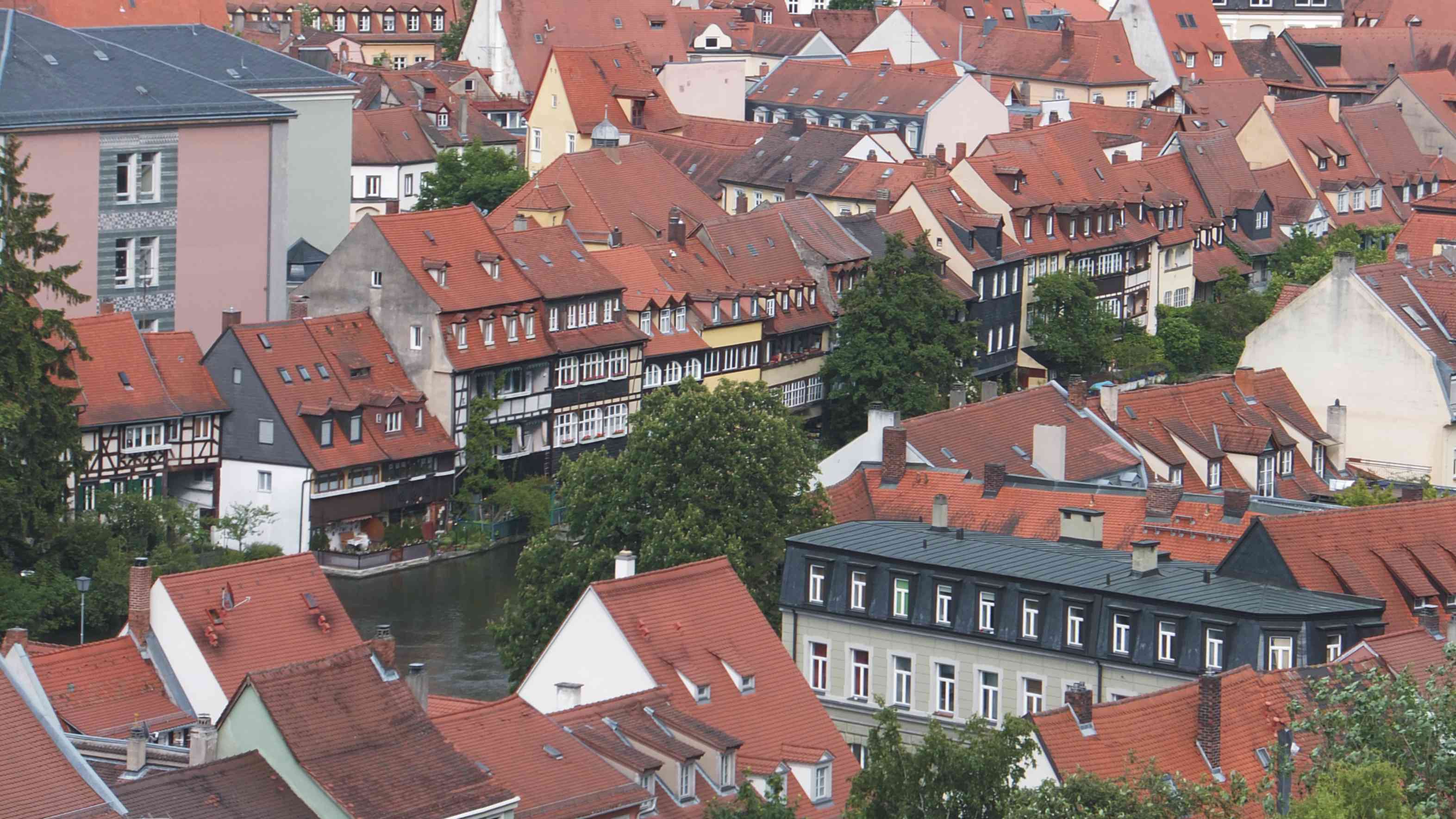 Nachdem wir uns stadtfein gemacht hatten, gingen wir über eine Brücke des Rhein-Main-Donau-Kanals zur Altstadt. Es gab erst mal eine Stärkung in Form von Kaffee und Kuchen. Dann folgte ein kleiner Einkaufsbummel für den Nachwuchs daheim. Nun machten wir eine Stadtbesichtigung zu den bekannten Sehenswürdigkeiten: dem alten Rathaus mit seinen Fresken, auf der Insel in der Regnitz, dann an der ehemaligen Fischersiedlung „Klein Venedig“ vorbei und danach den Berg hinauf zum Kloster St. Michael. Von dort hat man einen wunderbaren Blick über die Stadt. Leider ist die Kirche auf unbestimmte Zeit geschlossen, da umfangreiche Renovierungsarbeiten anstehen. Bei meinem Besuch vor vier Jahren hat mir das Deckengemälde mit den vielen Blumen und Heilkräutern besonders gefallen. Unser Weg führte mal rauf, mal runter. Ein Einheimischer erklärte uns, dass Bamberg, genau wie Rom auf sieben Hügeln erbaut wurde. Nun gingen wir zum Dom. Auch diesen konnten wir leider nicht besichtigen, da es bereits nach 19 Uhr war. Schade, ich hätte ihn gerne noch mal von innen gesehen.