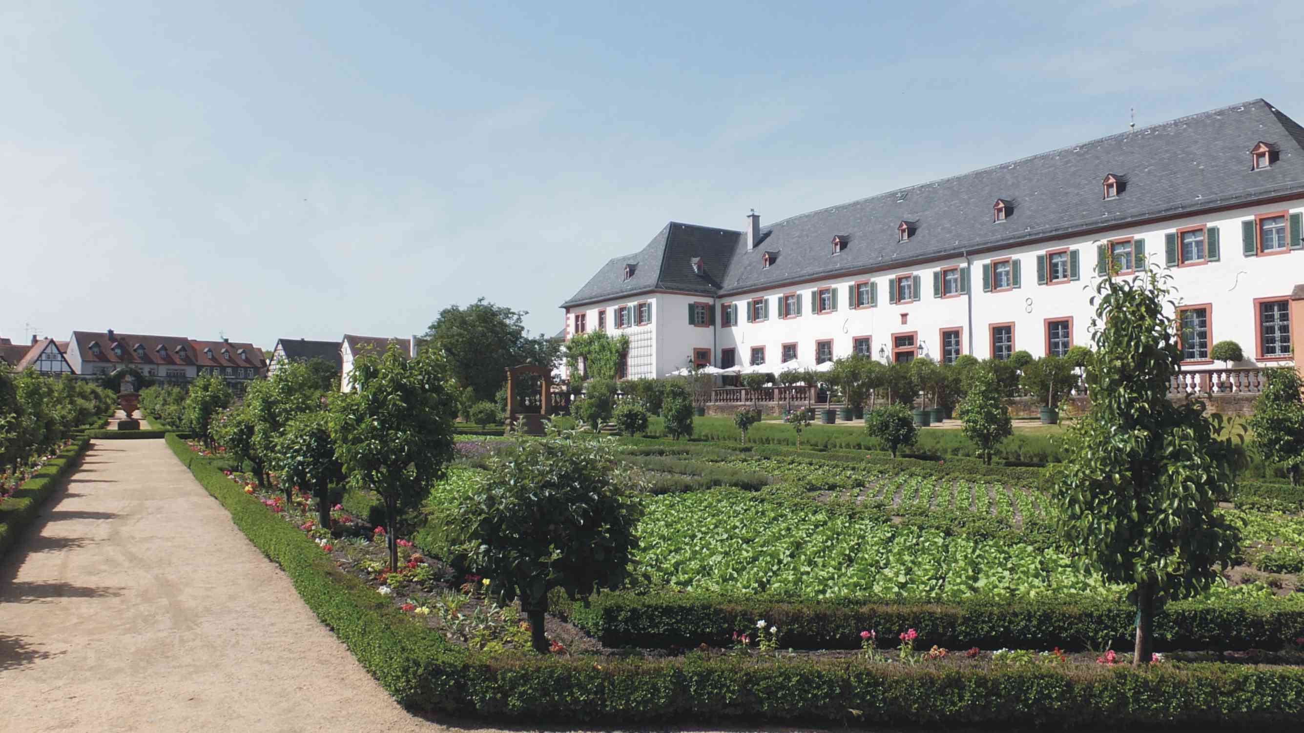 Nach knappen 20 km kam aber wieder etwas Besonderes. Wir erreichten Seligenstadt. Im Ortskern mit seinen schönen Fachwerkhäusern knubbelten sich die Touristen. Trotzdem gab es einen ruhigen Ort, an dem wir lange Pause machten; den wunderschönen Klostergarten der ehemaligen Benediktinerabtei. Im gepflegten Garten wuchsen neben Blumen und Kräutern auch Salat und Gemüse. Bei der drückenden Hitze war es eine Wohltat, sich hier zu erholen. Im angrenzenden Klostergarten tranken wir noch einen Eiskaffee. Hier gibt es eine Besonderheit. Das Cafe wird von Menschen mit Behinderung geführt. Hier war von Hektik keine Spur. Wir wurden sehr freundlich bedient und hätten, wenn es nicht so früh gewesen wäre, noch gerne von dem leckerern Kuchen probiert.