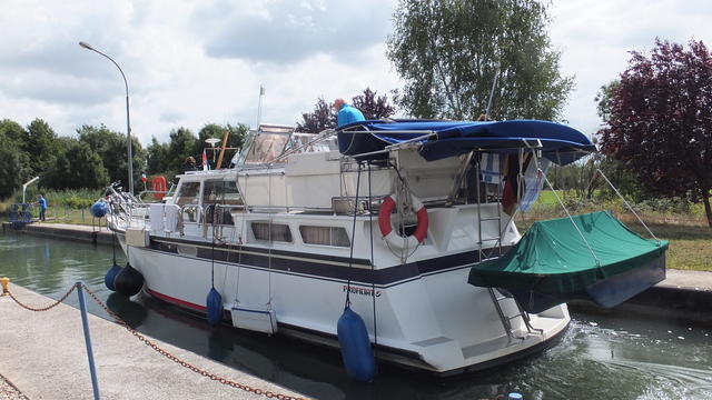 Wenig später, als wir gerade mal wieder einen Anstieg geschafft hatten, merkte ich, daß mein Hinterrad platt wurde. Klaus hat es aber schnell geflickt und kurze Zeit später konnten wir weiterfahren. Unsere körpereigenen Reserven ließen aber stark nach. Wir machten an einer Schleuse eine kurze Pause und sahen einem schönen Motorboot beim Schleusen zu. Derweil unterhielten wir uns mit dem Besitzer, der mit seiner Frau und einem anderen älteren Pärchen, gemeinsam auf großer Motorboottour war. So kann man sein Rentnerdasein auch genießen.