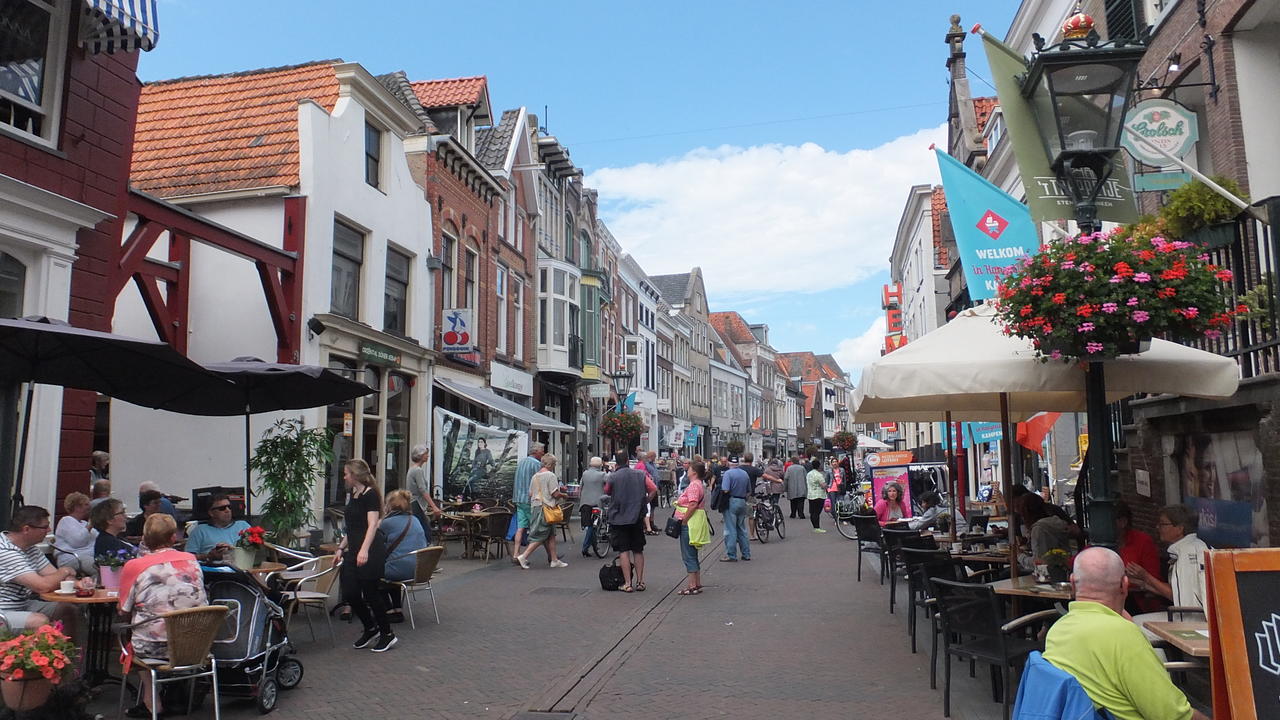 Da heute der Gegenwind fehlte, kamen wir gut voran. Etwa um 12 Uhr erreichten wir Kampen. Es war Markt und in der Fußgängerzone herrschte Hochbetrieb. Wir schoben unsere Räder ein Stück hindurch und fanden am Ende der Straße ein nettes, kleines Restaurant. Dort verbrachten wir unsere Mittagspause.