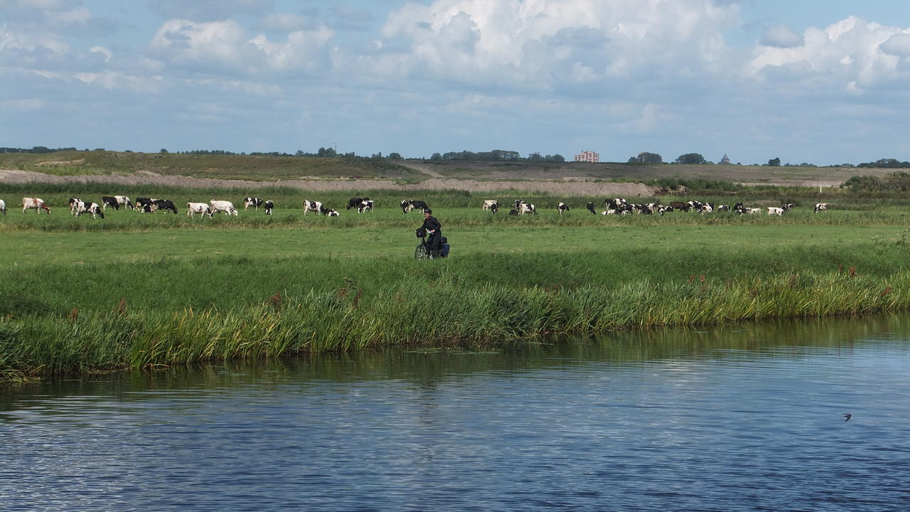 Gegen 14 Uhr setzten wir die Tour fort. Ab Noordeinde verlief der Weg meist auf einem Damm, auf der linken Seite mit Blick auf Wiesen mit Schafen und Kühen, auf der rechten Seite mit Blick auf das langgestreckte Drontermeer. Dort konnten wir in der Ferne viele Segel-und Motorboote beobachten.