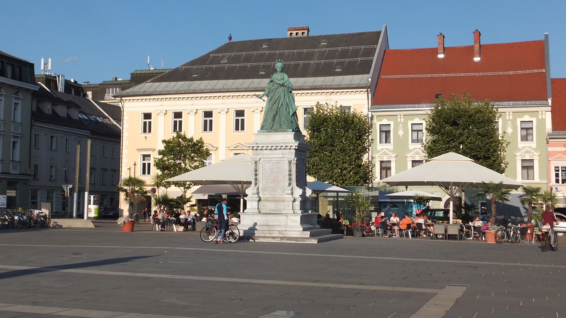 Nach dem Duschen machte ich noch einen Stadtbummel. Die Stadt hat mich sehr beeindruckt. Zuerst ging ich zum neuen Platz. In der Mitte befindet sich der Lindwurmbrunnen. Rings um den Platz herum befinden sich große, eindrucksvolle Gebäude. Auch ein Denkmal von Maria Theresia befand sich auf dem Platz. Ich bummelte an der St. Egid Kirche vorbei. Am alten Platz befindet sich eine Pestsäule, die sogenannte Dreifaltigkeitssäule. Ich ging weiter zum Landhaushof. Es ist ein historisch bedeutender und zugleich der representativste Profanbau der Stadt. Jetzt wäre es schön gewesen, einen Reiseführer zu haben, der einem einiges erklärt. So blieb mir nur, die schönen Gebäude zu betrachten, das gute Wetter zu genießen und durch die angrenzenden Straßen zu bummeln. Es herrschte eine richtige Sommerstimmung. Die Menschen schienen den Abend zu genießen. Ich machte einige Erinnerungsfotos und hätte bestimmt noch viele schöne Ecken entdecken können. Ich wollte aber pünktlich zum Abendessen erscheinen und beendete meinen Stadtrundgang.