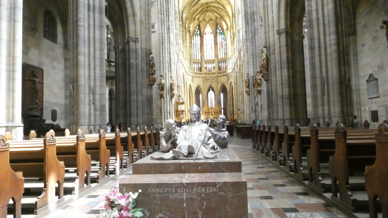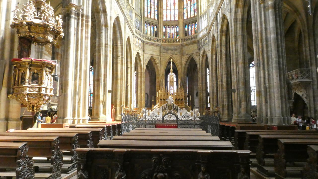 Nach einer halben Stunde waren wir am Hradschin. Wir mußten durch eine Polizeikontrolle, brauchten jedoch zunächst keinen Eintritt zu zahlen, was uns sehr verwunderte. Touristenmassen waren dort unterwegs. Um in verschiedene Gebäude zu gelangen, benötigten wir dann doch eine entsprechende Eintrittskarte. Da hieß es erstmal Schlange stehen. Nachdem wir dann die Karte in der Hand hielten, um in die Vitus-Kathedrale zu gelangen, hieß es wieder lange anstehen. Die Kathedrale war beeindruckend und zudem kühl. Draußen herrschten schon am Morgen hochsommerliche Temperaturen. Nachdem wir uns die Kirche angeschaut hatten und auf dem Innenhof standen, sah ich hoch oben auf dem großen Südturm einige Leute. Da wollte ich unbedingt auch hinauf. Also nochmal Eintritt zahlen und dann es ging die 240 Stufen nach oben. Die Mühe hat sich gelohnt. Der Blick über die ganze Stadt war unbeschreiblich. Danach machten wir erstmal Pause in einem netten Biergarten auf dem Gelände.