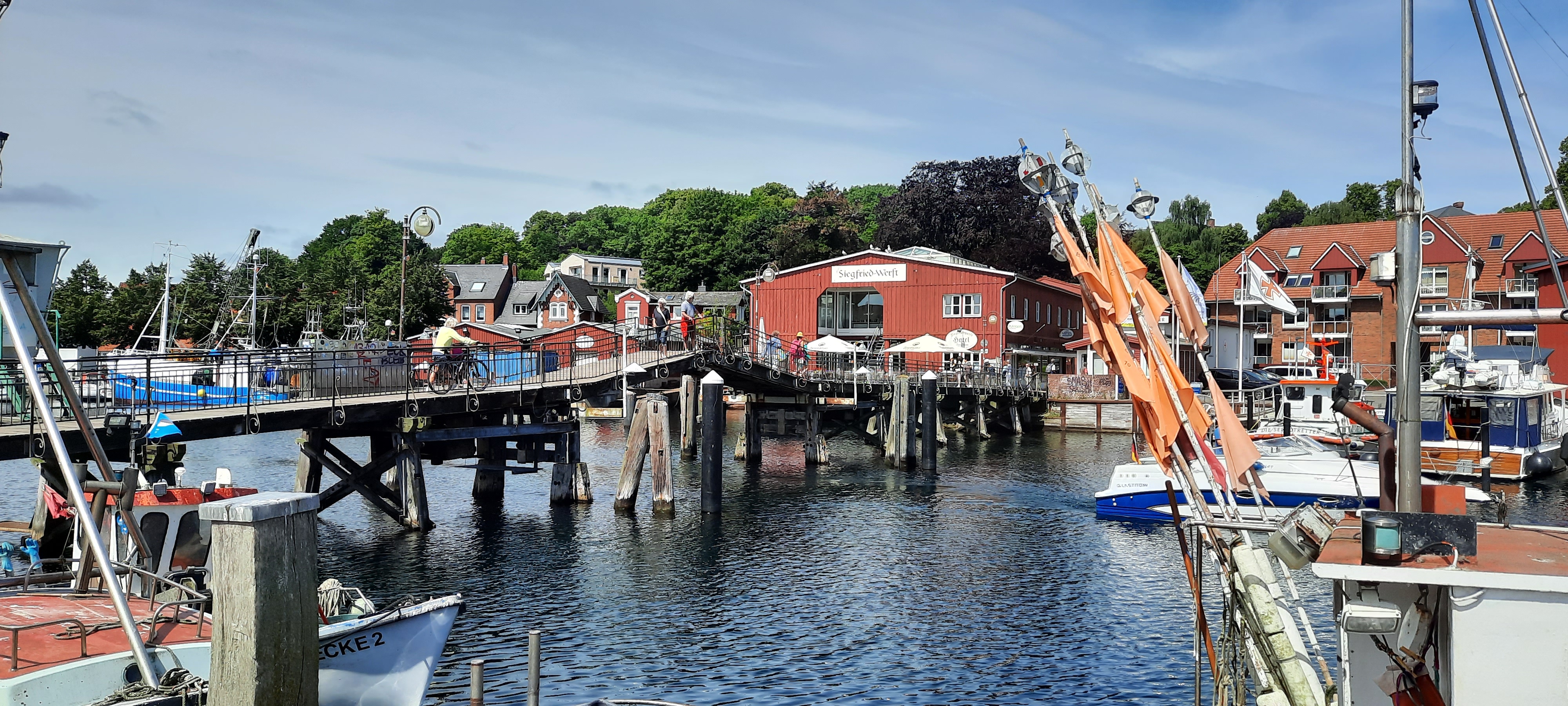 Gegen Mittag erreichten wir die Stadt. In einem kleinen Park an der Eckernförder Bucht machten wir eine kleine Pause, bevor es in die Innenstadt ging. Hier war einiges los. Wir schoben unsere Räder durch die Fußgängerzone und gönnten uns vor einer Eisdiele einen dicken Eisbecher. Vor über 30 Jahren hatten wir hier zwar schon einmal unseren Urlaub verbracht, aber jetzt kaum etwas wiedererkannt.
