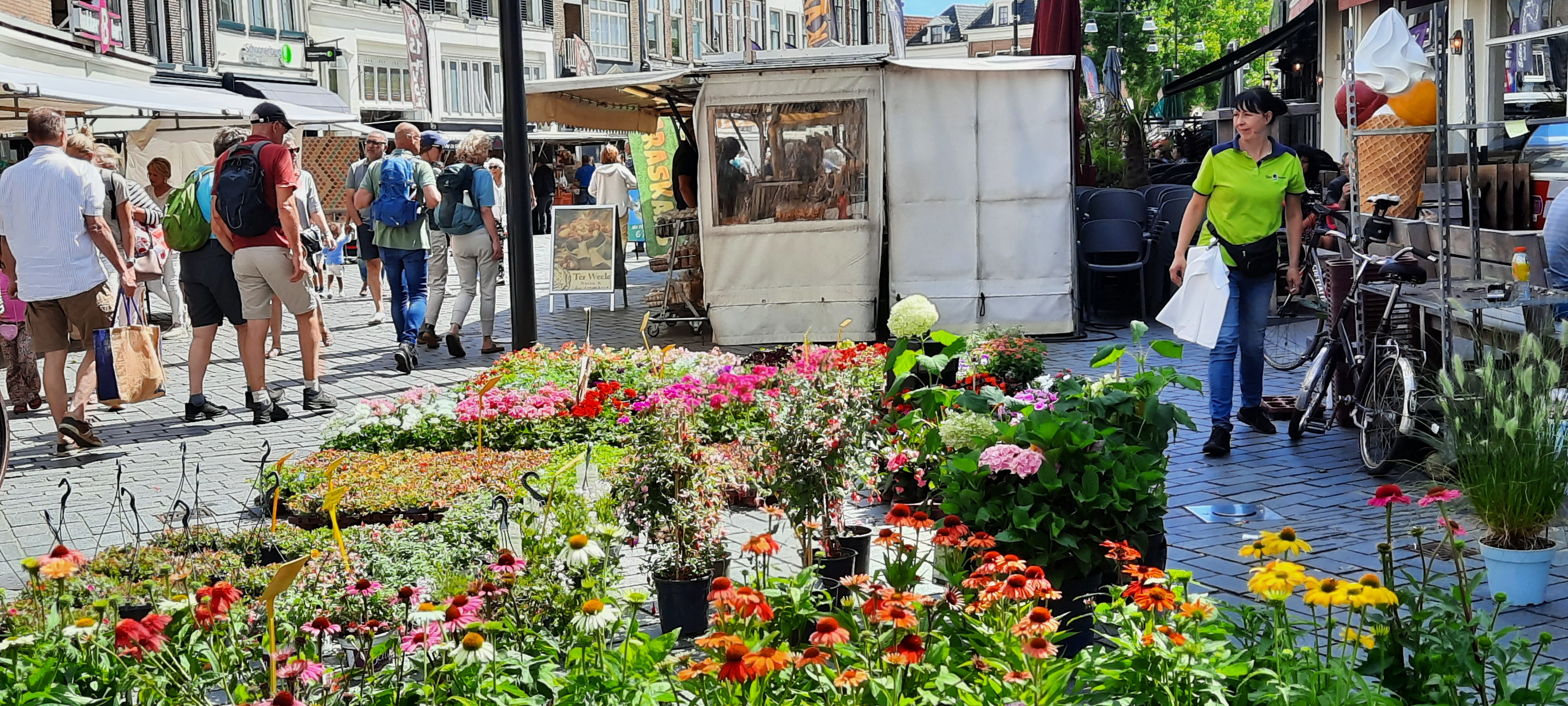 Auf einer Bank im Schatten der Sint Walburgiskerk machten wir unser Mittagspicknick. Es gab Baguette, Käse und Obst. Danach schoben wir unsere Räder durch die schöne, alte Hansestadt. Es war Markttag und es herrschte ein buntes Treiben. An den Ständen wurden die verschiedensten leckeren Sachen angeboten. Davon konnten wir auf dem Rad schlecht etwas mitnehmen. So blieb es beim Anschauen. Bevor es auf den weiteren Weg ging, gönnten wir uns in einer ruhigeren Seitenstraße einen Kaffee.
