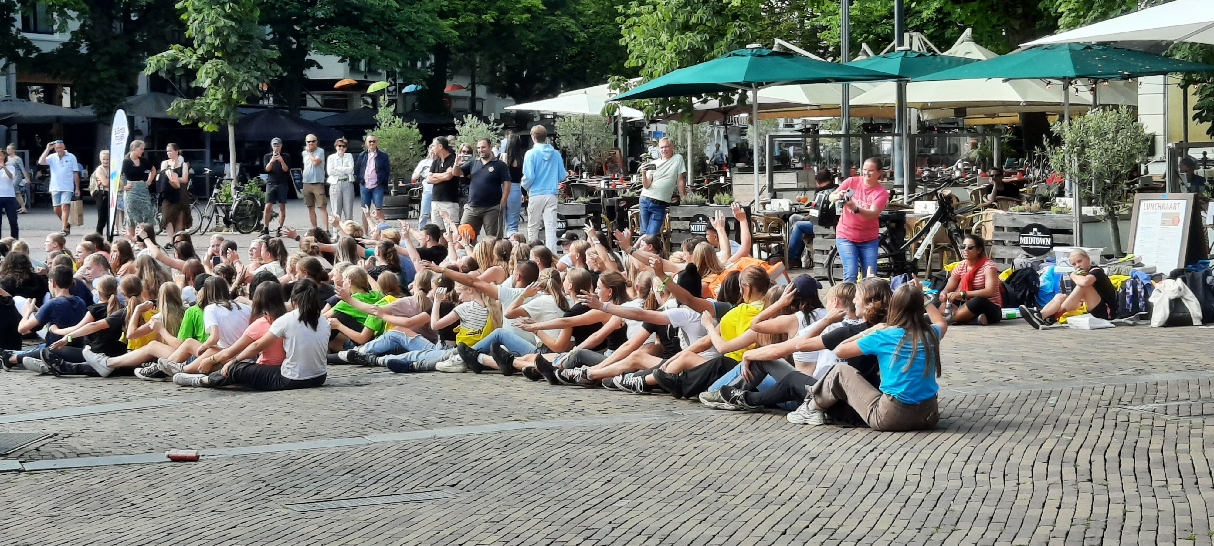 Unsere Aufmerksamkeit weckten aber die vielen jungen Leute, die eine Art Choreographie machten. Zu Musik bewegten sie sich zunächst alle in Reihen, dicht hintereinander sitzend, auf dem Boden vorwärts und bewegten die Oberkörper und Arme mal nach vorne, nach hinten oder seitlich. Es sah sehr fröhlich aus und sorgte bei den Zuschauern für gute Laune. Nachdem wir eine Weile zugeschaut hatten, fuhren wir in großem Bogen um die Innenstadt, bis wir wieder zu unserem Ausgangspunkt gelangten.