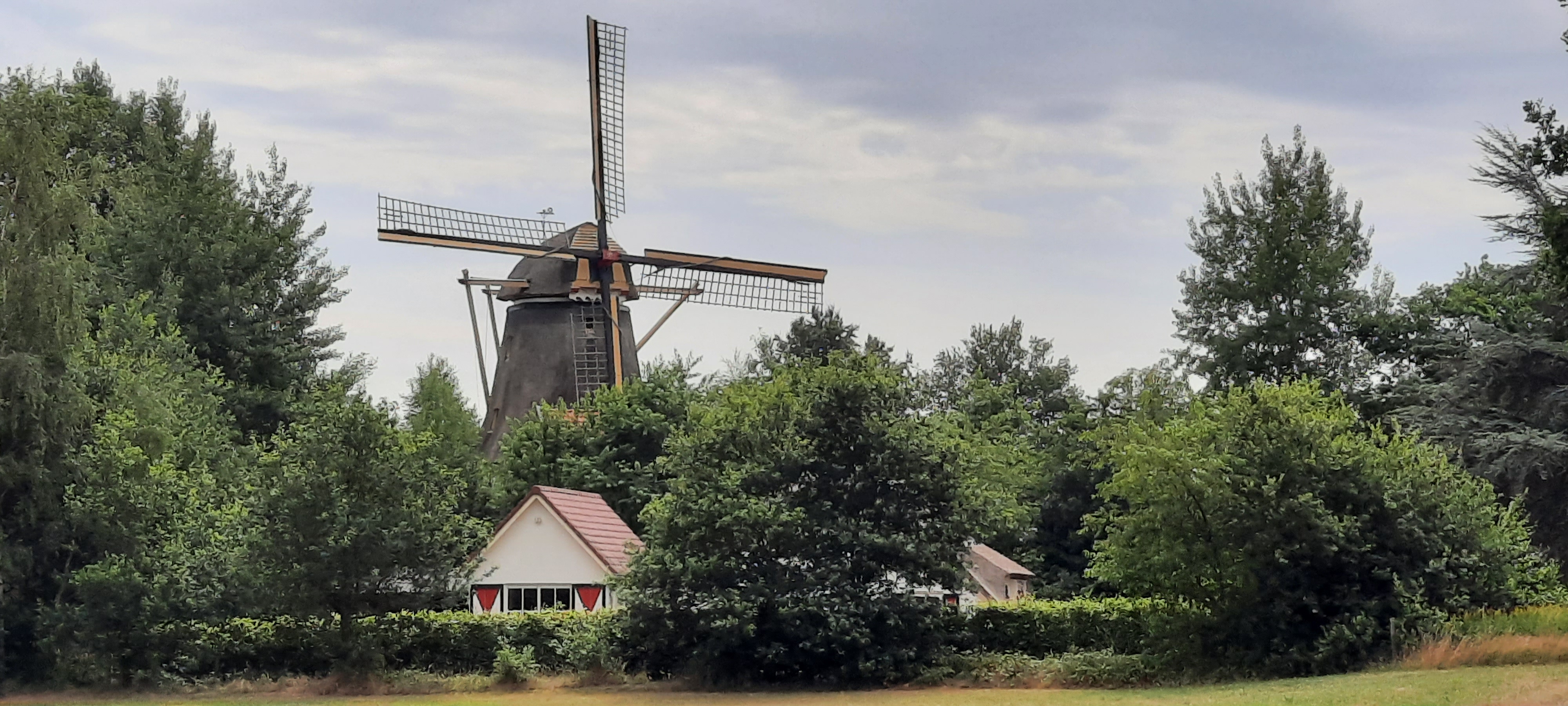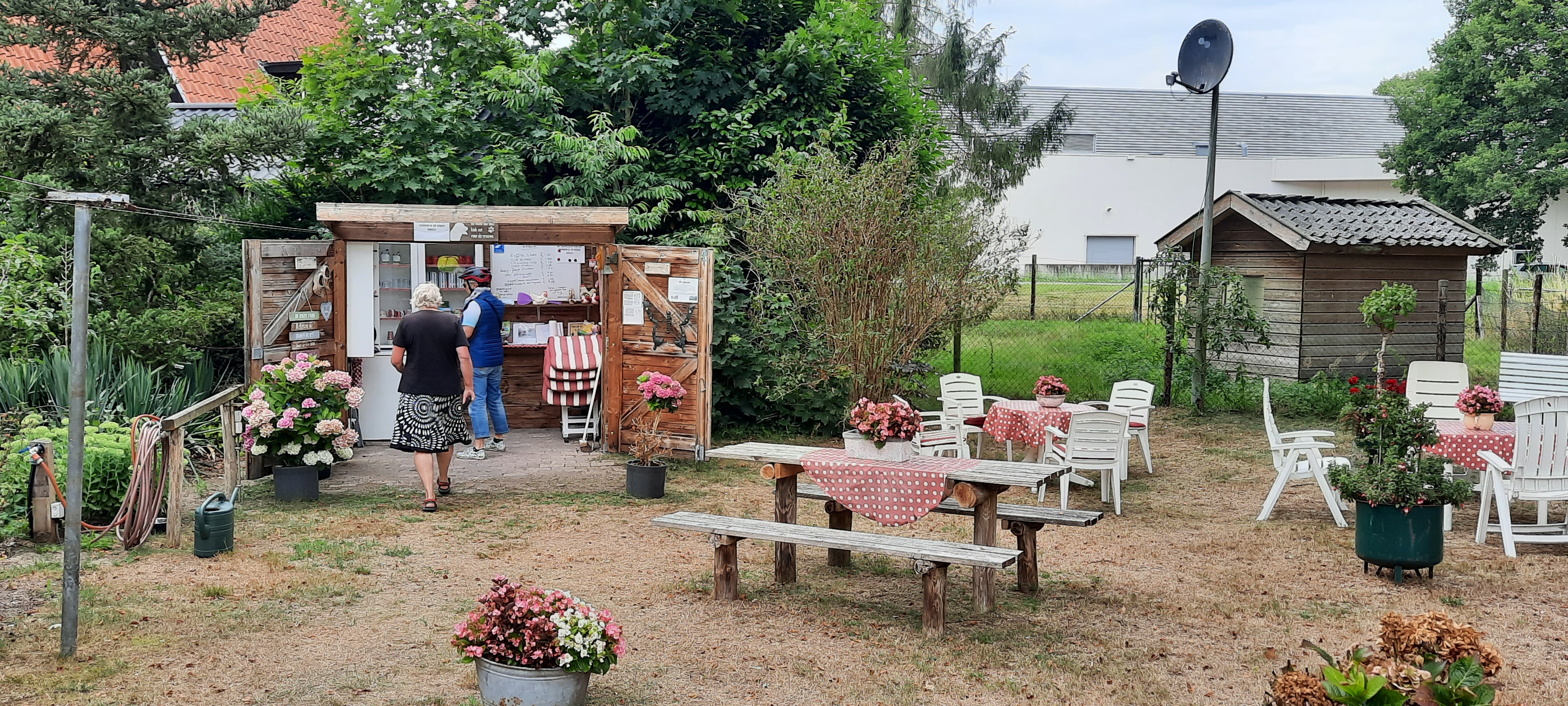 Unsere Gastgeberin hatte uns für unterwegs noch Brote mitgegeben. Dazu fehlte uns nur noch ein Kaffee. Es war kurz nach 12 Uhr. Am Ortseingang von Wagenfeld fanden wir genau das Passende. Auf einer Wiese standen ein paar Bänke, Gartenstühle und Tische, hübsch eingedeckt mit rot-weiß karierten Tischdecken. Ein kleines Gartenhäuschen hatte die Türe weit geöffnet. In dem Häuschen befand sich ein Kühlschrank mit Kuchen. Dazu standen darin Geschirr, Besteck, Kaffeepulver usw. zur Selbstbedienung. Eine Preisliste hing daneben. Es war ein einladendes, kleines Gartencafé. Von Pulverkaffee waren wir aber nicht so richtig angetan und wollten gerade wieder weiterfahren. Da kam der Besitzer des Gärtchens, der gegenüber wohnte und bot an, Filterkaffee für uns zu kochen. Das war wirklich nett und wir blieben natürlich. Zum Kaffee aßen wir dann unsere Brote und Obst. Es war eine Pause, die man nicht so schnell vergißt. Wir durften danach sogar noch im Haus das WC benutzen. Es bewahrheitet sich mal wieder: Niederländer sind meist locker und unkompliziert.