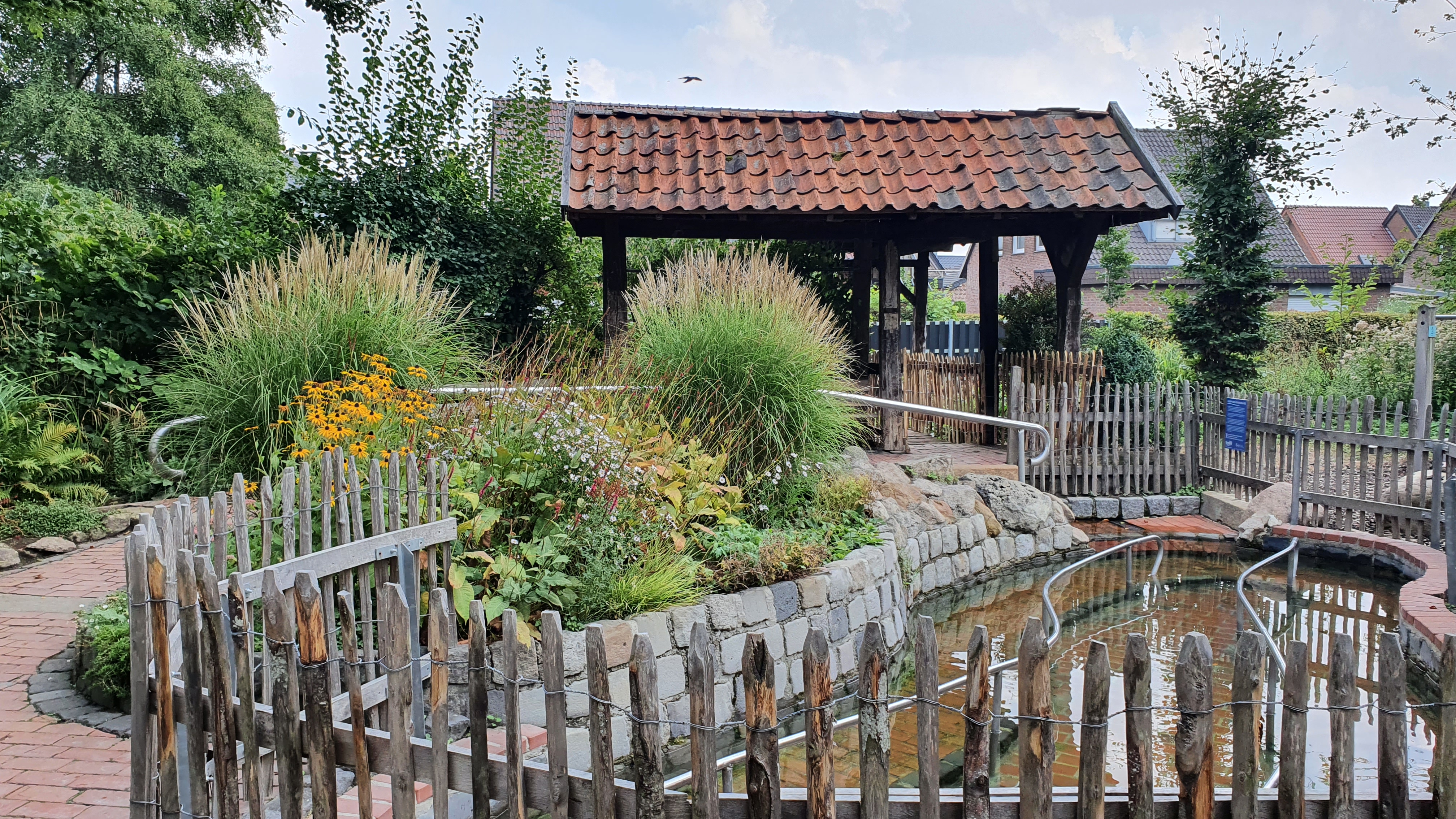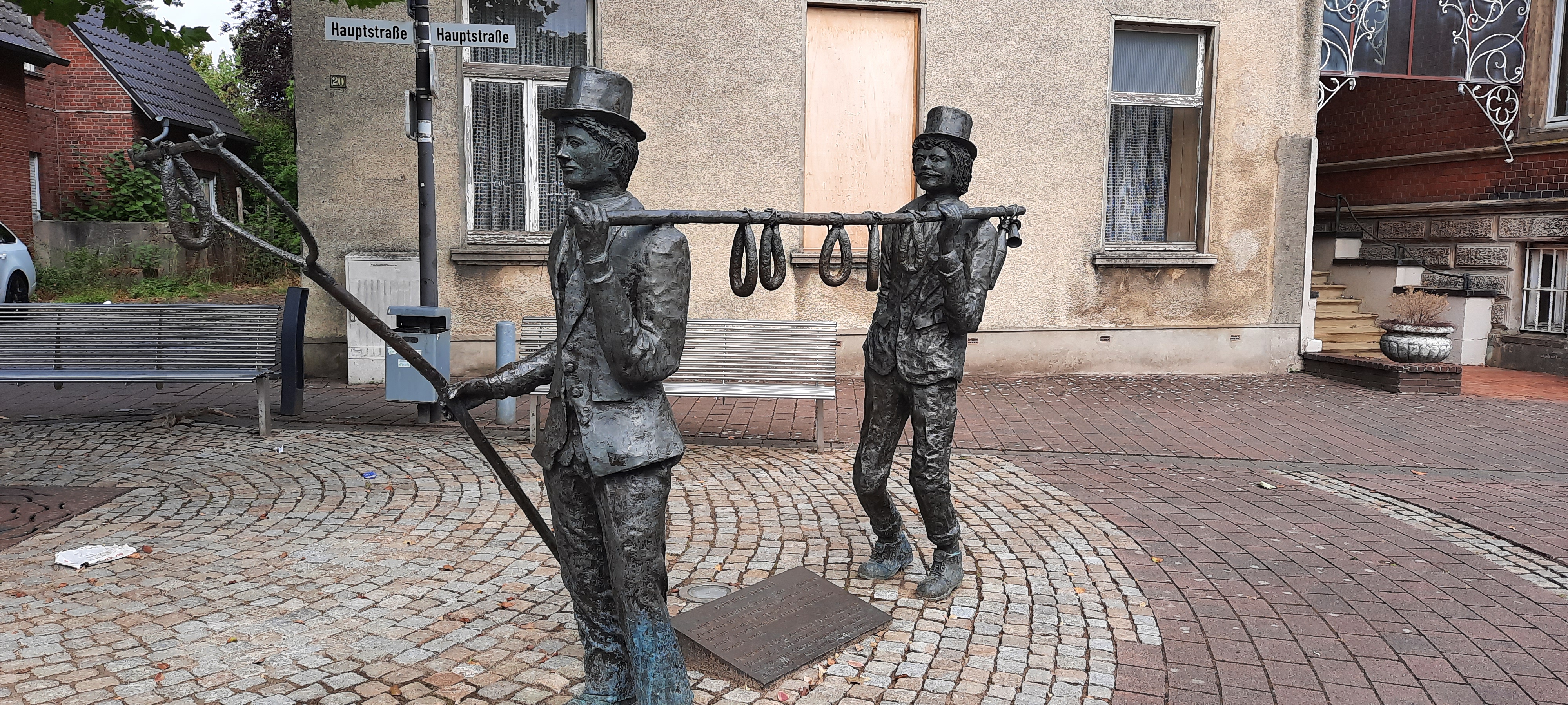 Unser erstes Etappenziel war der Stadtpark von Ramsdorf. Hier bestaunten wir eine große Fischtreppe an der Bocholter Aa. Danach ging es weiter, an der Burg Ramsdorf vorbei, bis zur St. Walburga Kirche. Vor der Kirche fotografierten wir zwei nette Bronzefiguren, vermutlich Vater und Sohn. Ein paar Meter weiter befindet sich das Heimathaus von Ramsdorf. Es hatte leider geschlossen. Vor dem Gebäude standen alte Gerätschaften aus früheren Schmieden.