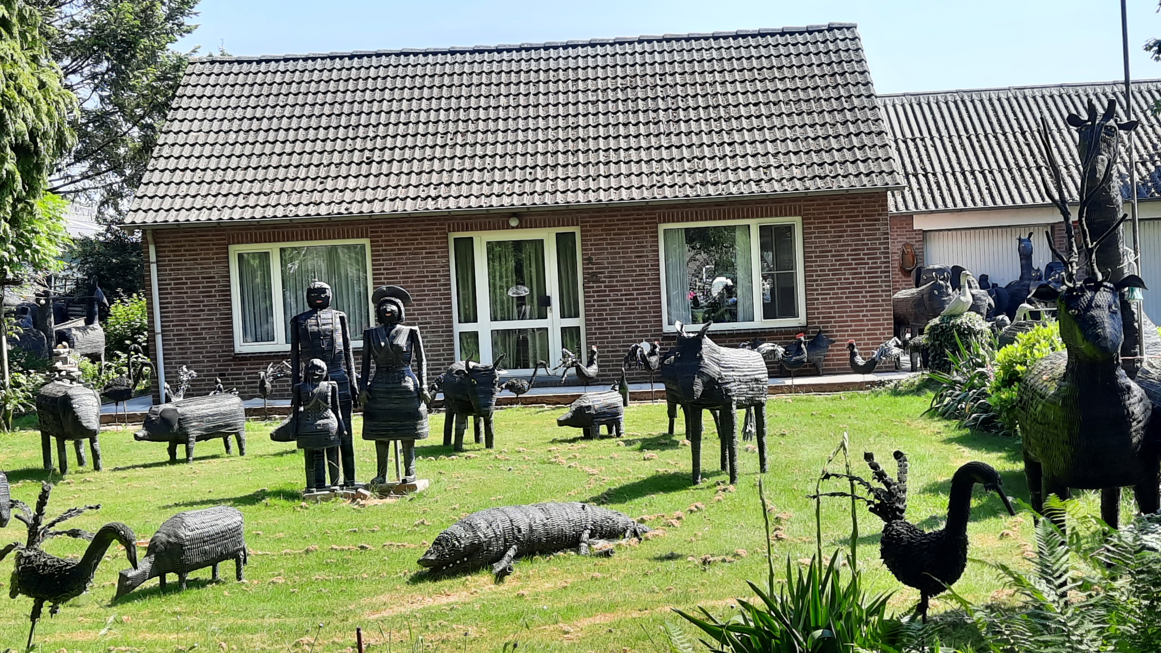 Kurz vor Mittag kamen wir an einem Grundstück vorbei, auf dem in einem Vorgarten verschiedene, große und kleine Tiere standen, die aus alten Gummireifen oder Fahrradschläuchen gemacht worden waren. Das waren für uns natürlich willkommene Fotomotive.
