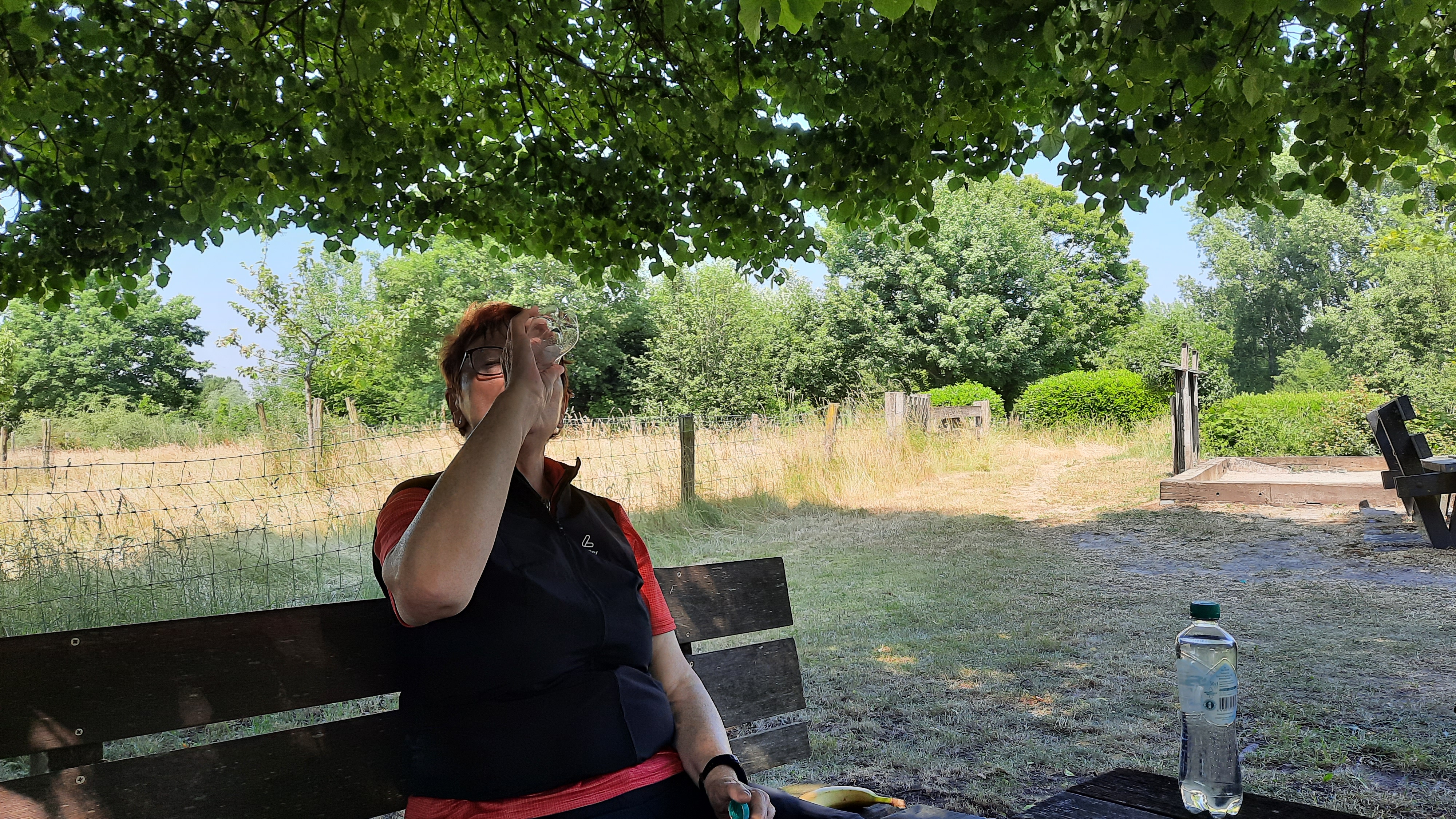 Laut Wettervorhersage sollte es wieder sehr heiß werden. Deshalb wollten wir uns zuerst mit Getränken eindecken. Wir fuhren nach meinem Handynavi und nach Knotenpunkten. Nach gut 5 km bemerkte ich, daß wir auf der falschen Spur unterwegs waren. Ich hatte mir im Vorfeld zu Hause zwei unterschiedliche Routen aufgespielt und vergessen, die, die wir nicht fahren wollten, zu löschen. Also ging es noch mal ein Stück den gleichen Weg zurück. Dadurch gelangten wir aber zu einem Supermarkt, den wir vorher nicht entdeckt hatten. Wir kauften die Vorräte für unterwegs ein und es konnte nun richtig losgehen.