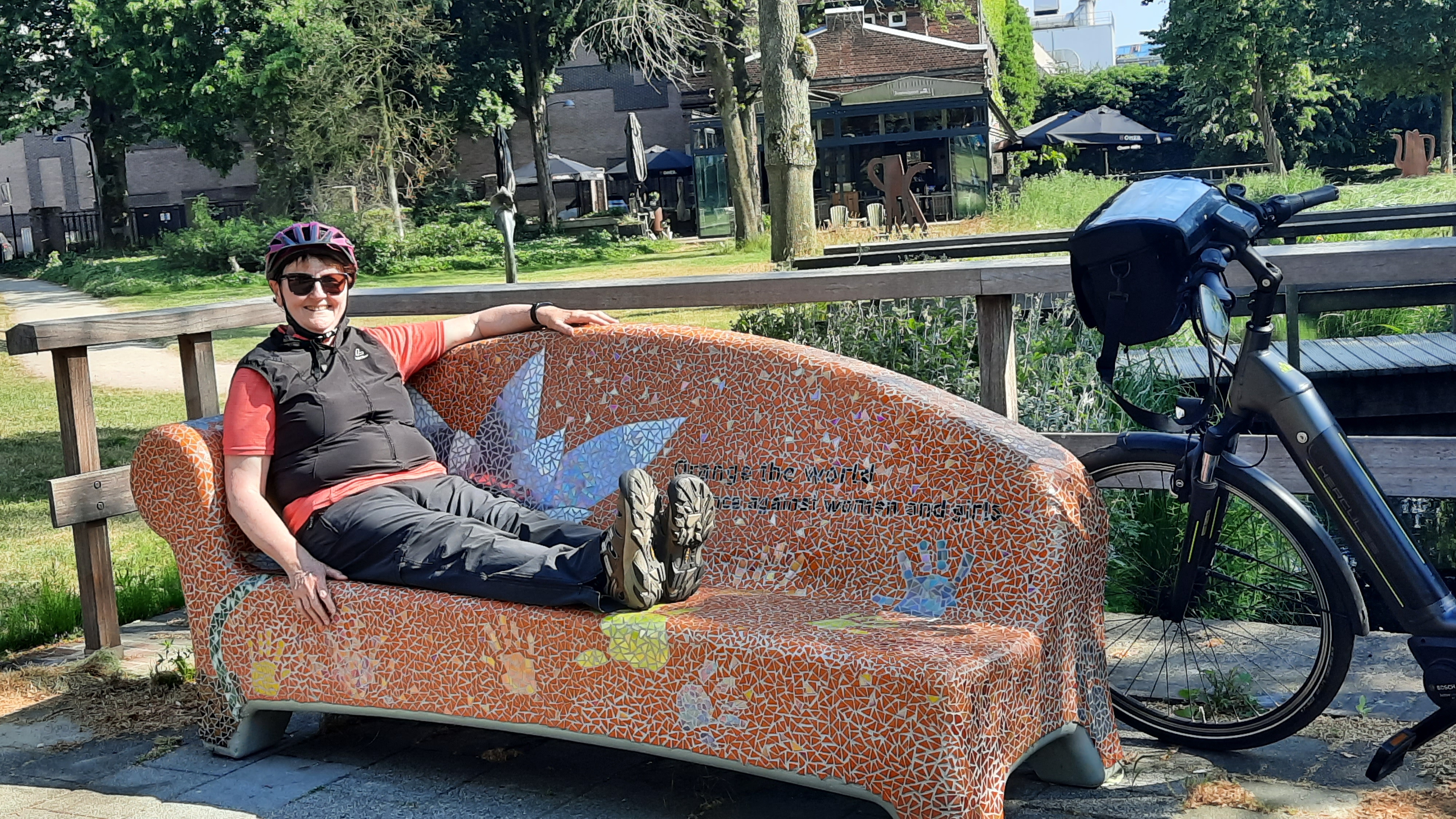In den Niederlanden braucht man selbst in größeren Städten keine Angst vor Autoverkehr zu haben. Es gibt überall gut ausgebaute Radwege, meist in jeder Fahrtrichtung einen, oder sie sind durch eine Trennlinie getrennt. Hildegard sagte einmal: „wenn die Radwege besser sind als die Straßen, ist man in Holland.“ Kurz vor 17 Uhr erreichten wir Schloß Helmond. Es ist eine quadratische Wasserburg und das größte Wasserschloß der Niederlande. Es liegt in einem schönen Park. Im Park befinden sich ein paar ausgefallene, bunte Steinbänke, auf denen Hildegard sich niederließ, in der Hoffnung ihren König zu empfangen. Der ließ sich aber leider nicht blicken. Nun ging es auf die letzten Kilometer zu unserem heutigen Tagesziel nach Deurne.