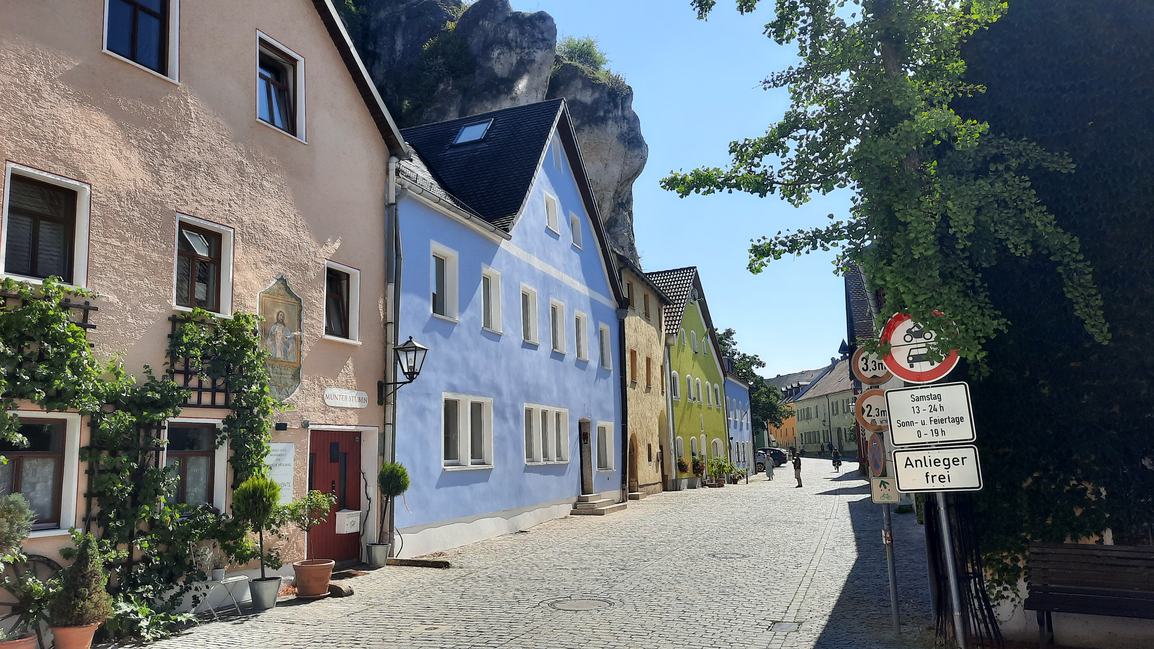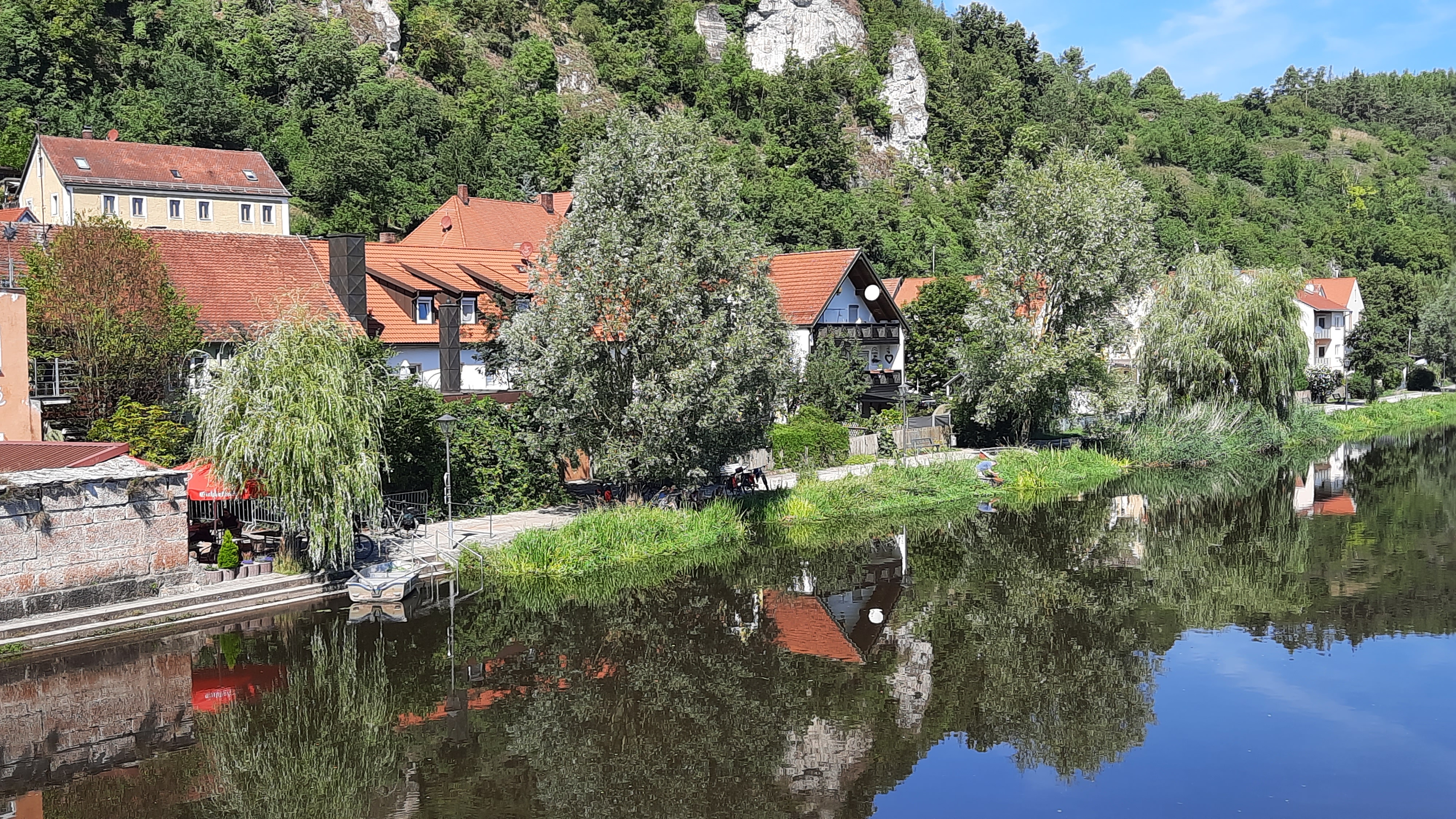 Nach zwei Stunden waren wir in Kallmütz. Das Örtchen ist sehr malerisch. Es liegt direkt unterhalb einer Felswand und unmittelbar am Ufer der Vils. Einige Häuser sind sogar in den Fels gebaut. Eine schmale, gepflasterte Straße mußten wir uns mit Autos und Fußgängern teilen. Diesen hübschen Ort wollten wir nun doch etwas länger genießen und gönnten uns eine Pause. Ein leckerer Eiskaffee kühlte uns innerlich ab.