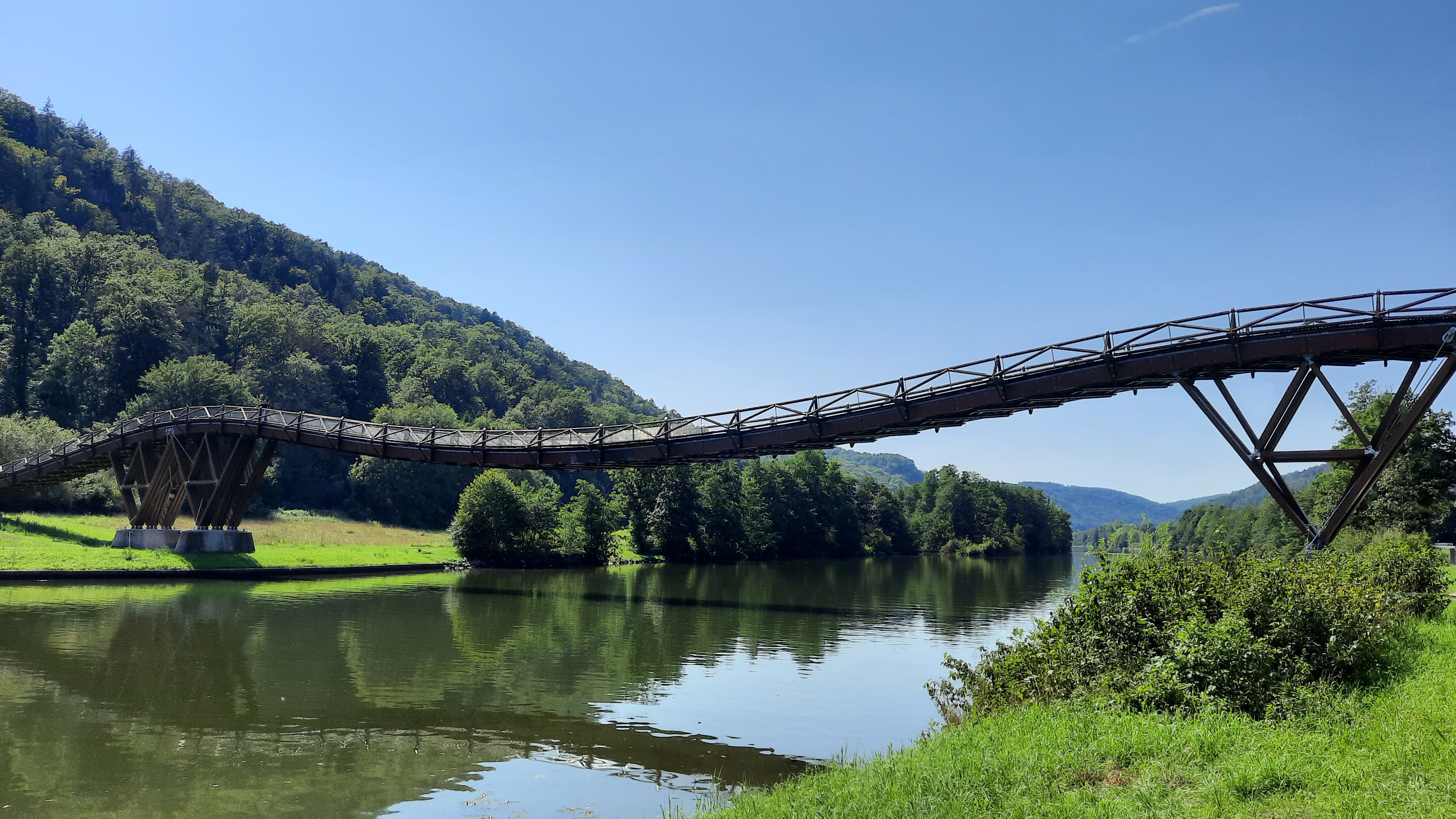 Wenig später gelangten wir an eine geschwungene Holzbrücke den „Tatzlwurm“. Bis 2006 war sie die längste Holzbrücke Europas. Wir blieben weiter auf dem Radweg und machten ein paar Fotos von der ungewöhnlichen Brücke. Sogar ein Flußkreuzfahrtschiff fuhr gerade auf der Altmühl. Die Passagiere hatten ihre Kameras gezückt, als sie unter der Brücke durchfuhren.