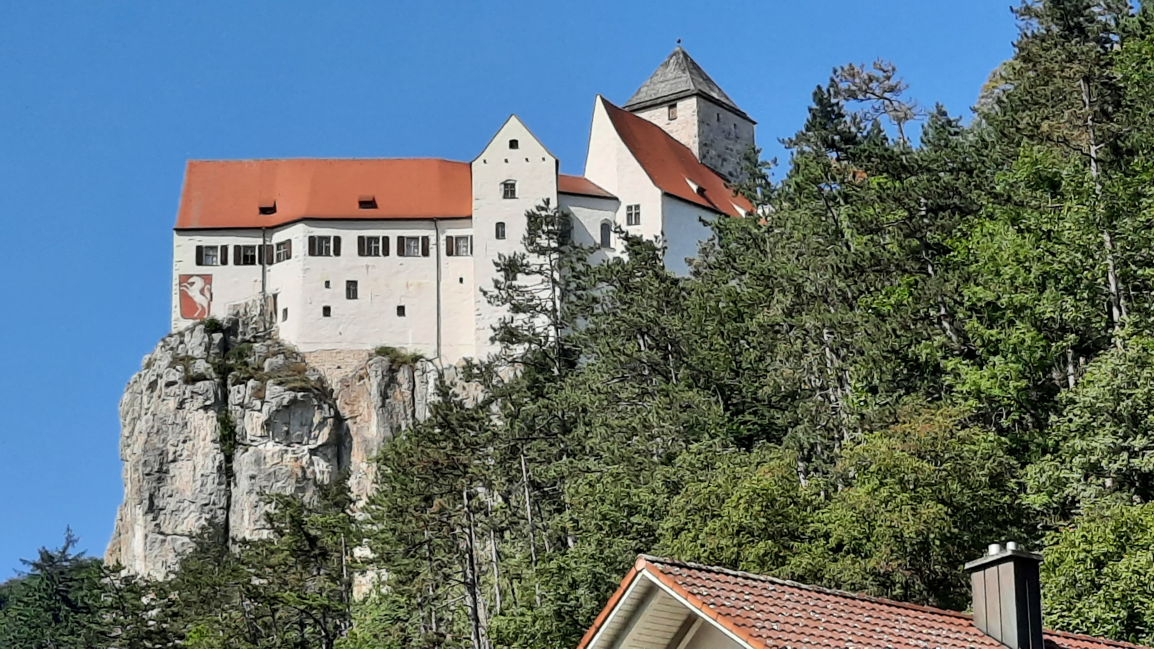 Ein Stück weiter erblickten wir auf einem 70 Meter hohen Felsvorsprung die Ritterburg Prunn. Schon von weitem erkennt man auf der weißen Mauer ein rotes Wappen mit einem weißen, aufbäumenden Pferd. Sie zu besichtigen, wäre sicher interessant. Das hebt man sich aber besser für eine Tour mit dem Auto auf.