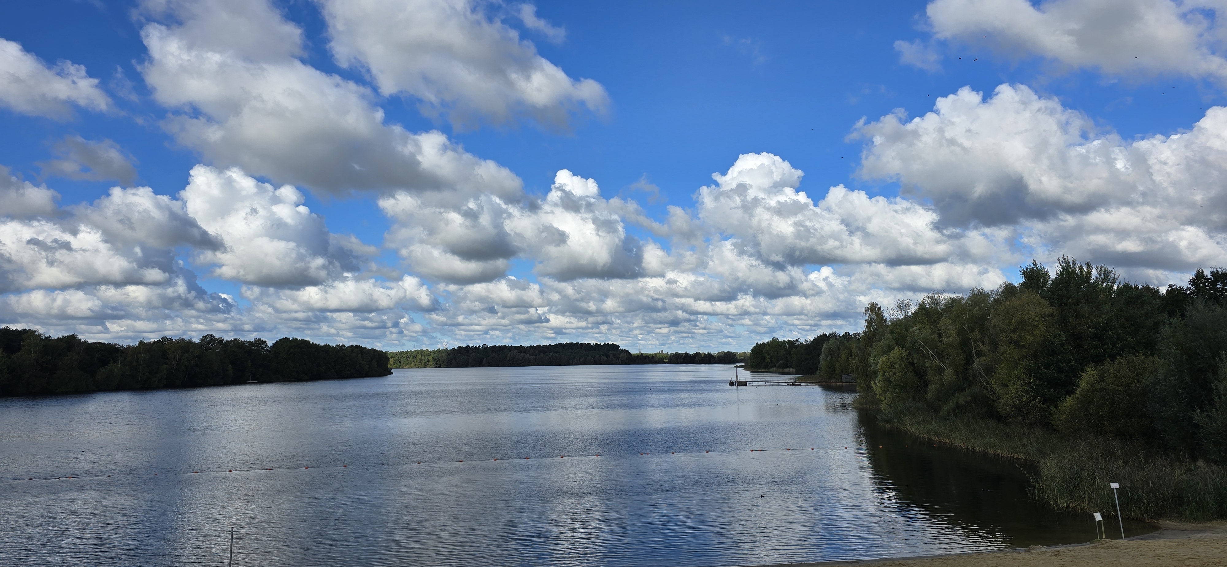 Eine halbe Stunde später waren wir am Offumer See, einem ehemaligen Baggersee. In dem Ausflugslokal herrschte reger Betrieb. Das gute Wetter lud viele zu Ausflügen in die Natur ein. Ungewöhnlich ist die Aussichtsplattform über den See. Sie befindet sich auf großen Trichtersilos, in denen der Sand zwischengelagert wurde. Von dort oben machte ich ein paar Fotos. Danach setzten wir unsere Tour fort.